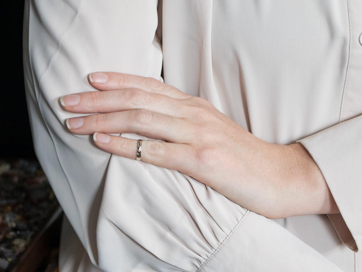 This band is the perfect addition to any jewelry collection. Crafted from gleaming white gold, it features a delicate wheat pattern to add a touch of charm and elegance. Wear this beautiful mini band as a fun and eye-catching accessory.