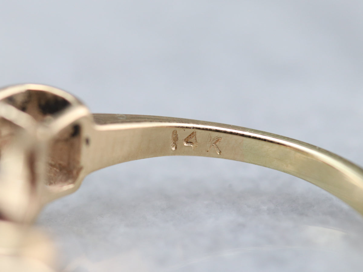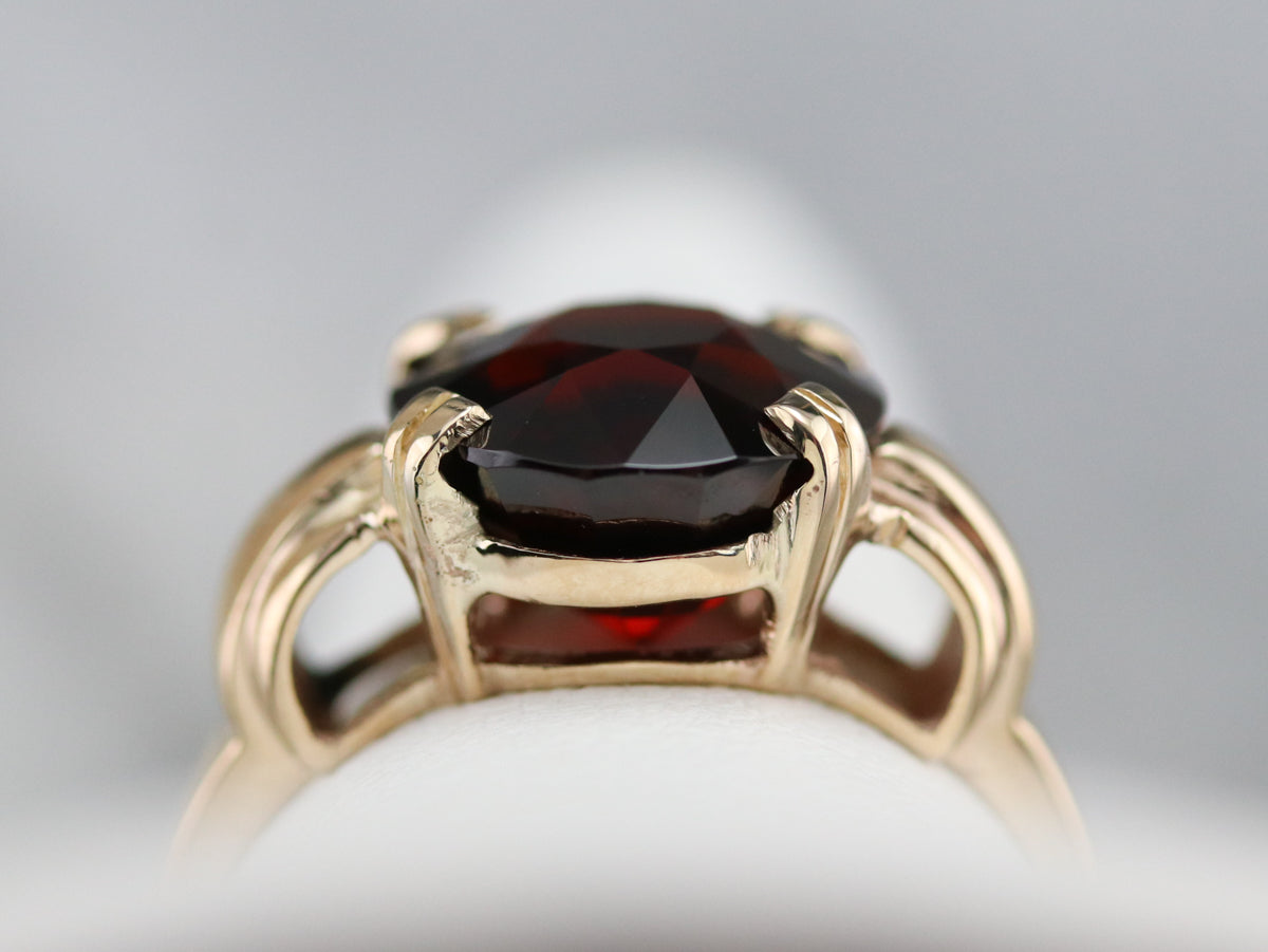 This mounting dates to the Retro Era, a sophisticated and refined time period for jewelry design. The shoulders feature a sleek pattern, the better to reflect light into the gorgeous center stone. We've set this vintage mounting with a lovely, deep red garnet. Flashing with bright raspberry highlights, this gem shines with fire and light!