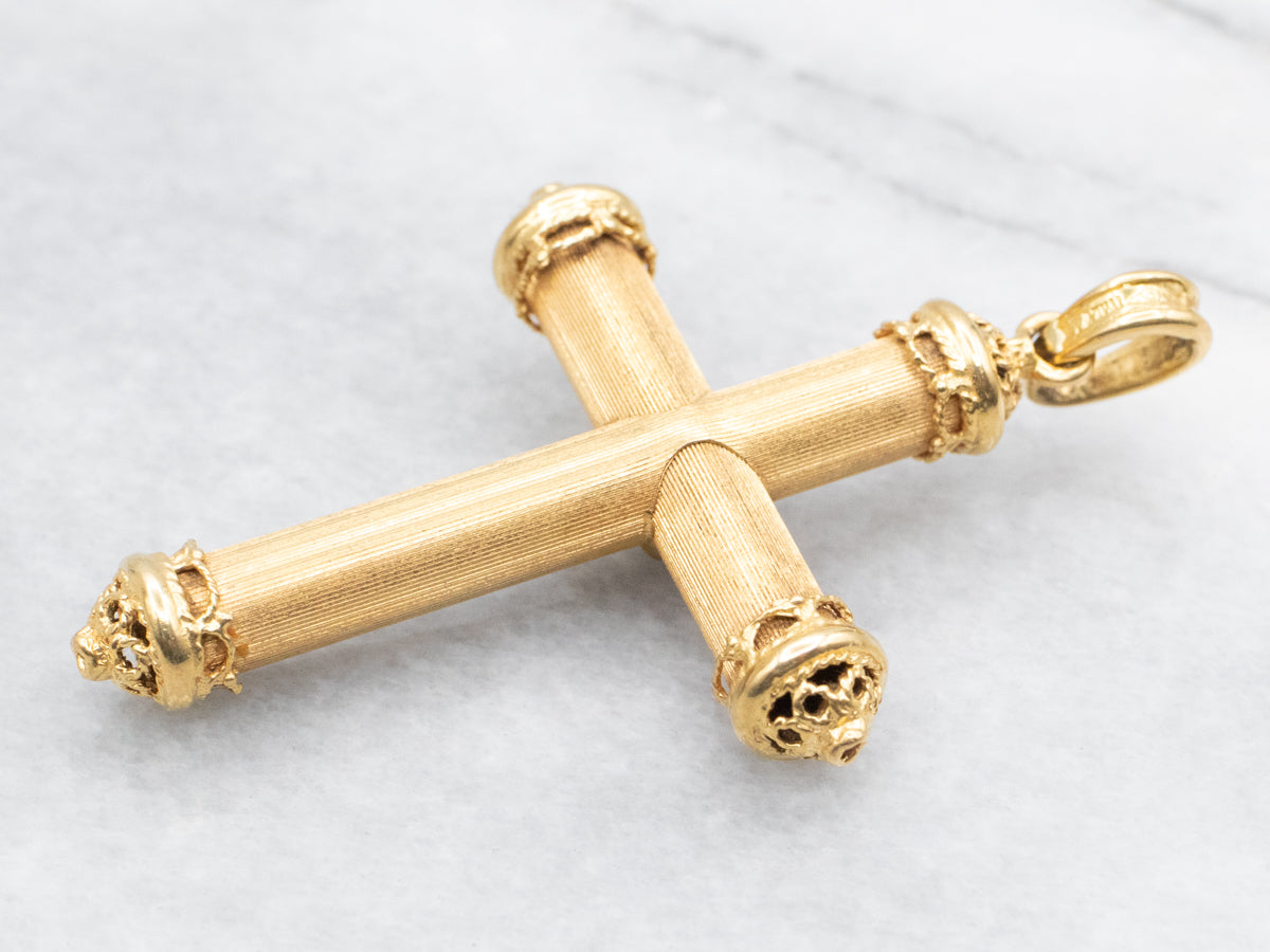 Add a touch of vintage charm with this cross pendant featuring a stunning garnet cabochon. The intricate texture adds a unique twist while the garnet stone brings a touch of elegance. Crafted with yellow gold for a timeless look!