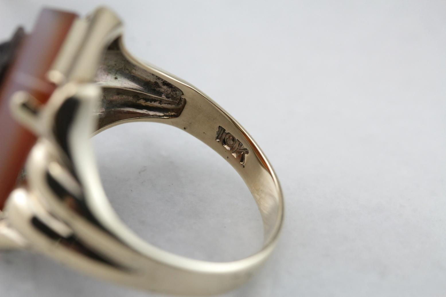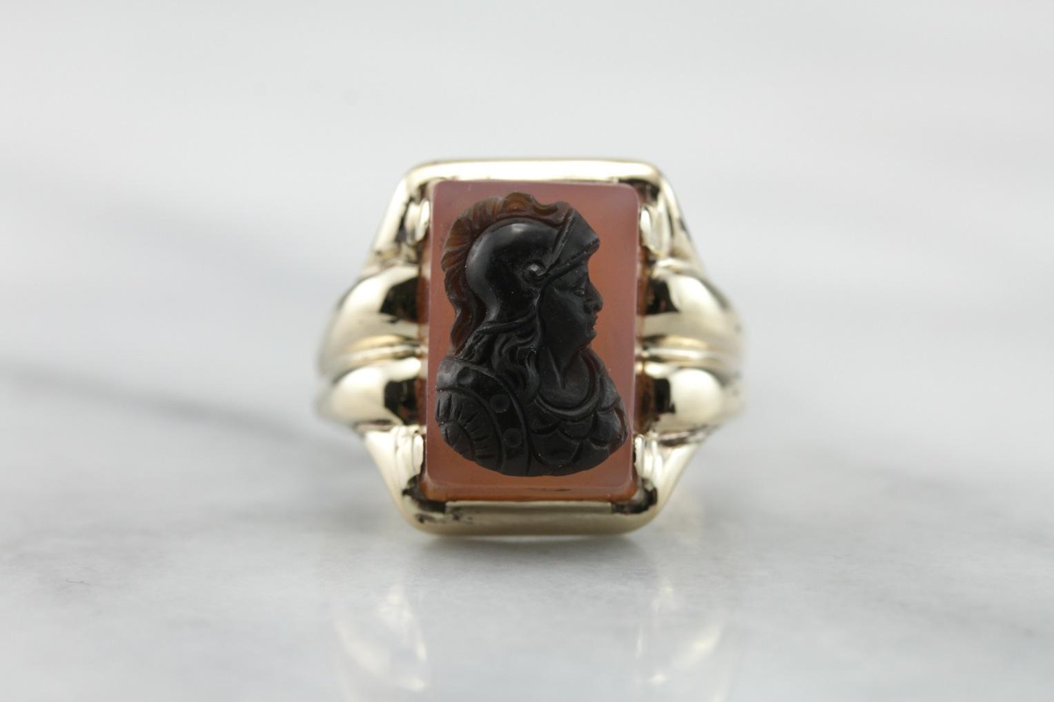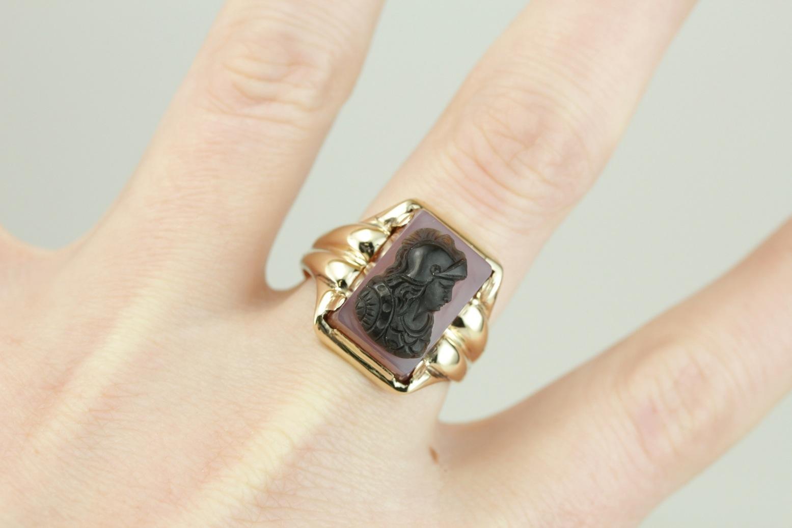 This is truly an incredible ring. Large and chunky and yet lightweight, it still sits well on the finger and is very comfortable, even on a small hand. At the center is an ornately carved cameo in black, red and translucent white onyx depicting a Roman soldier in exquisite detail.