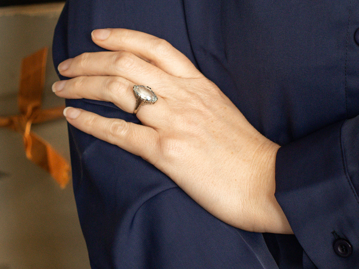 This solitaire ring features a stunning marquise cut blue topaz stone, which we've elegantly set into a timeless Art Deco design. The perfect accessory for adding a touch of sophistication to any outfit.