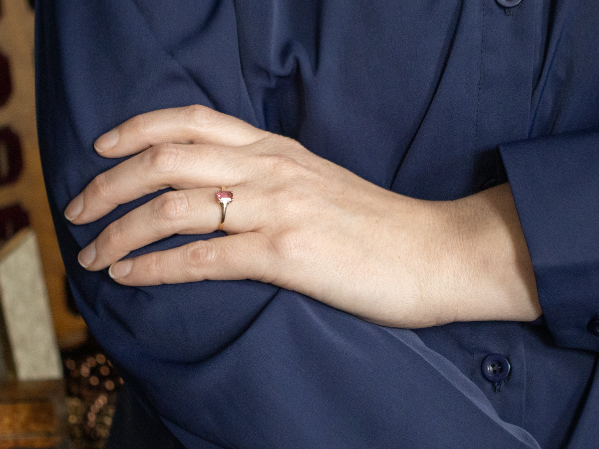 The color of cherry blossoms in springtime, this pink tourmaline has intense shine and plenty of life! We've set this in a vintage gold mounting. Low to the hand and easy to wear, this will be a favorite for years to come.