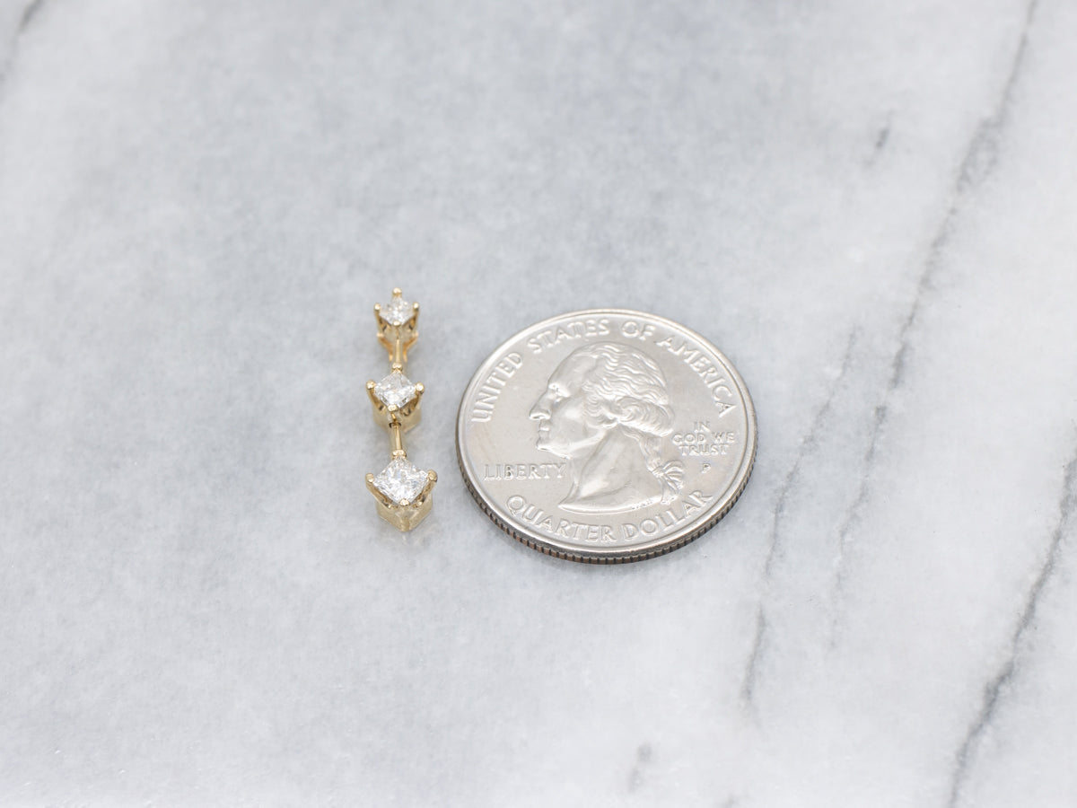 Metal: 14K Yellow Gold Gem: 3 Diamonds totaling .40 Carats, H-I in Color, I in Clarity Gem Measurements: 3.3 x 3.3 mm, Princess Cut Measurements: 5 x 22 mm, with bail Marks: "14K NAJ" Stamped on the reverse