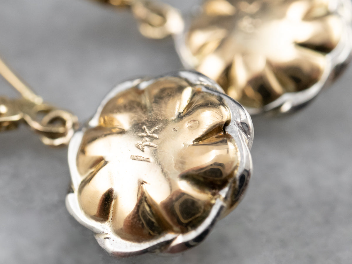 These drop earrings are one-of-a-kind! The mother of pearl disks are centered with bright white seed pearls and framed in simple bezels of white gold. Unique and yet classic, these would make wonderful wedding earrings!