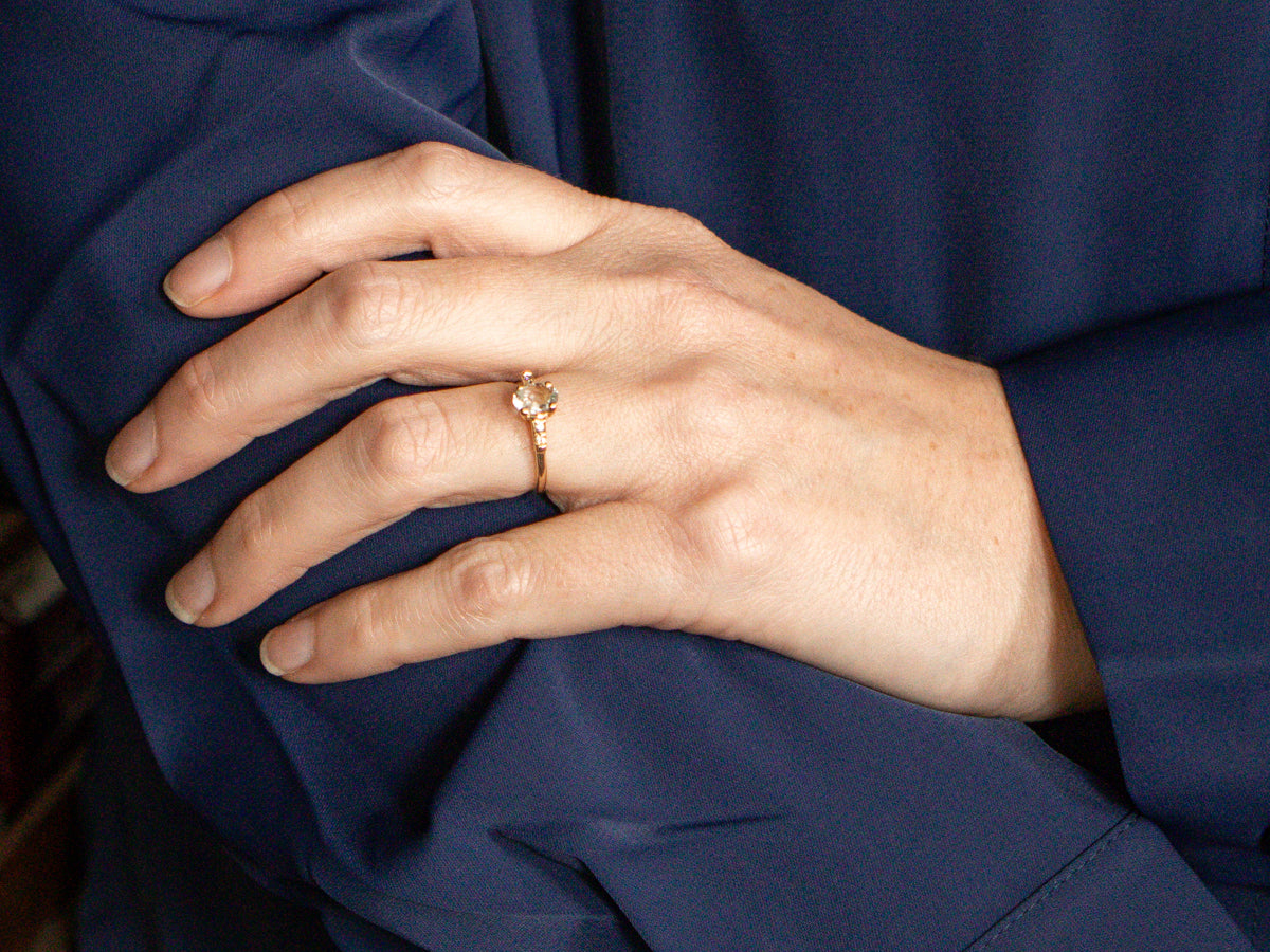 This gemstone ring is flirty and fabulous! The stone is a pale green quartz, sometimes known as green amethyst, in a dreamy sage hue. Excellent faceting gives the stone lots of sparkle while the twinkling diamond accents up the glam factor even more!