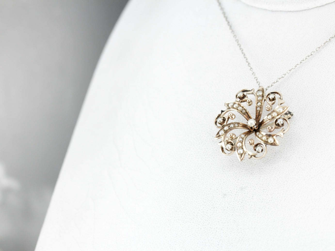 So beautiful! This antique rose gold brooch dates to the late 1800's. It's paved with seed pearls, each one individually set in its own little mounting. What makes this piece even more special is that it can be worn on a chain or ribbon as a pendant!