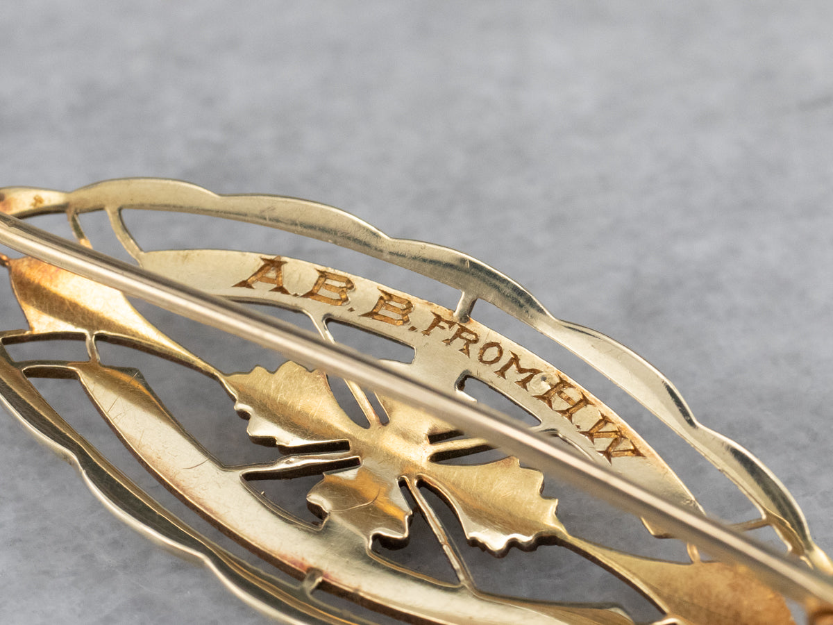 This vintage filigree brooch is beautifully crafted! Look closely and you'll see engraved floral motifs, scalloped edging, and sparkling textured. This piece is in beautiful condition and sure to be loved for years to come!