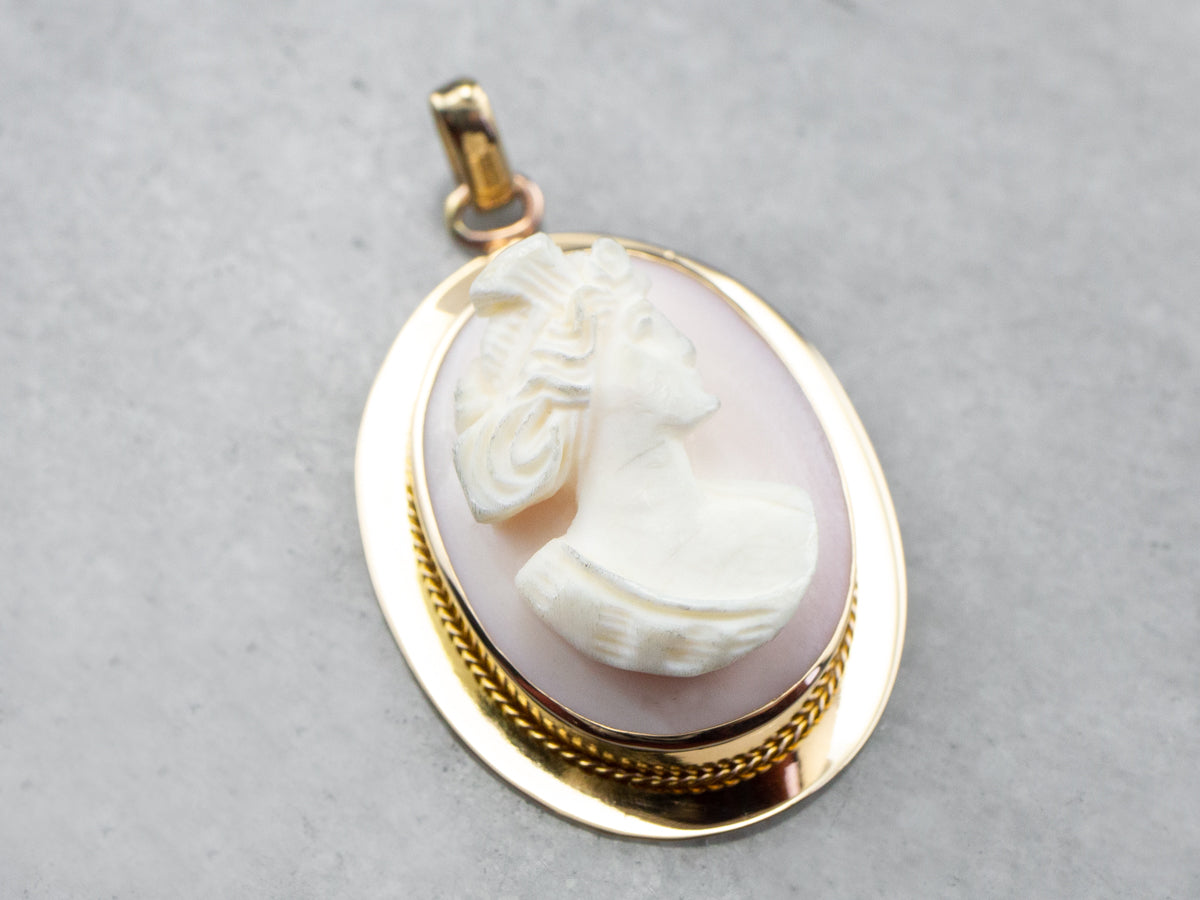 This lovely pendant is crafted in wonderful tones of yellow and pink with accents of creamy white! 10K yellow gold comprises the frame, while the cameo at the center is carved from a soft pink conch shell.