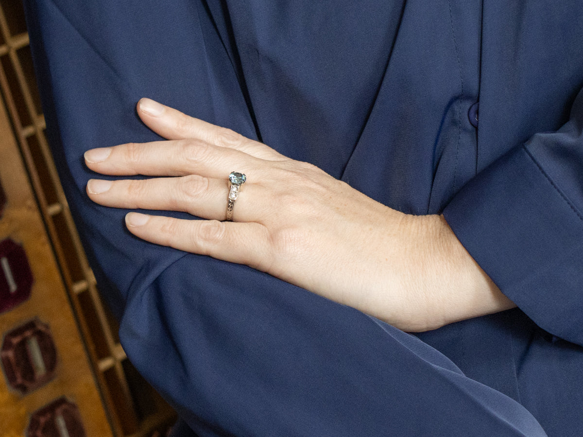 What a wonderful vintage mounting! Simplistic and yet artistic, this pretty mounting has a romantic flair, tempered in style by the stylized hearts on the undercarriage. We've set this pretty piece with a bright blue zircon gemstone, a gorgeous stone that has a wonderful teal blue color!