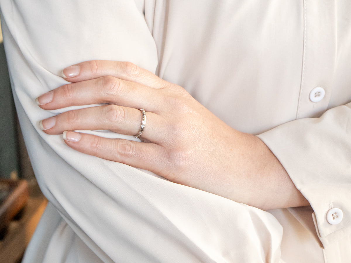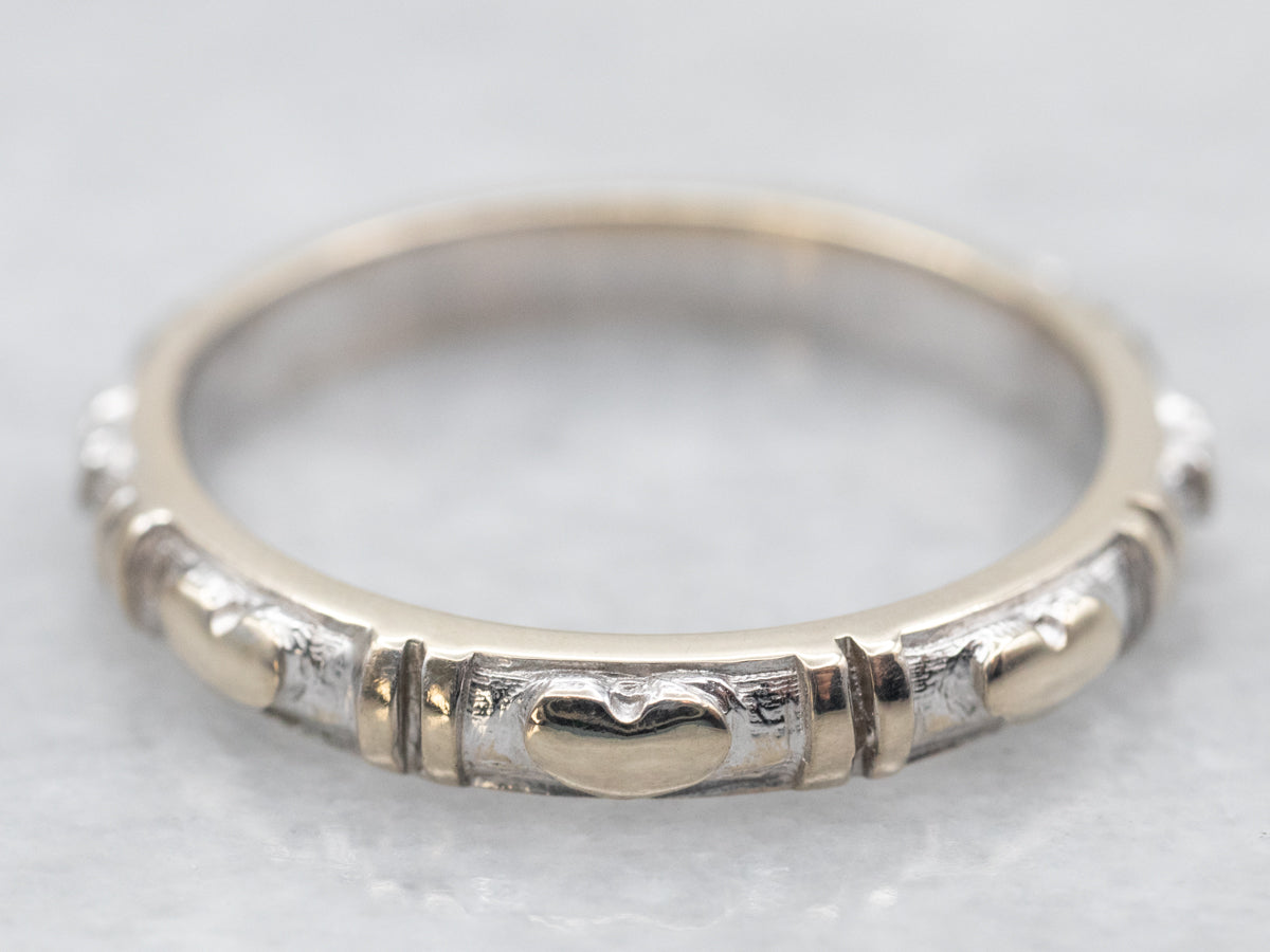 This gorgeous band captures all the love in the world, with its stunning white gold and enchanting heart pattern design. Stand out from the crowd and add a heart-filled sparkle to your look!
