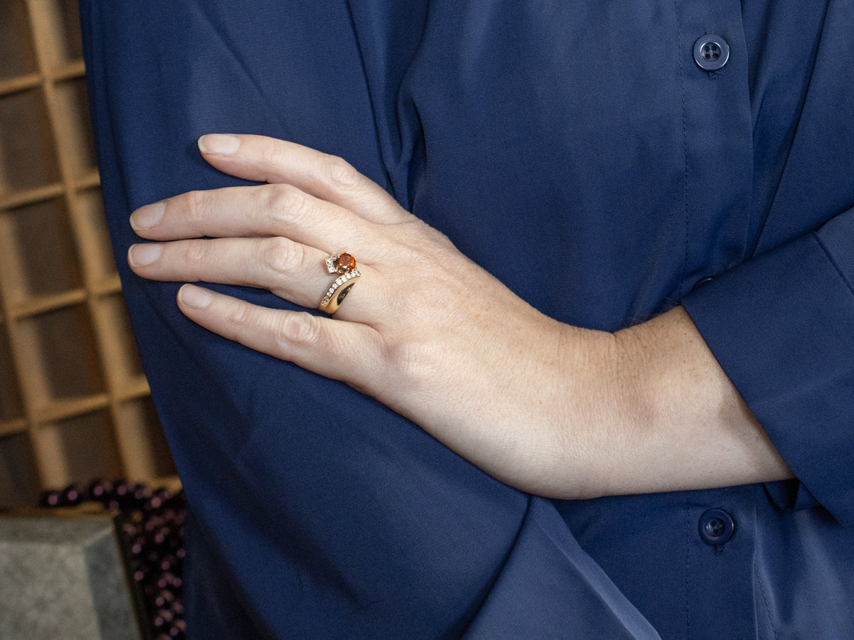 The stunning hessonite garnet and sparkling diamond accents create a timeless design that will surely make a statement. The bypass style adds a unique touch, while the yellow gold adds a bit of warmth to this ring. Perfect for any occasion, this garnet and diamond ring will no doubt be a beautiful addition to your jewelry collection.