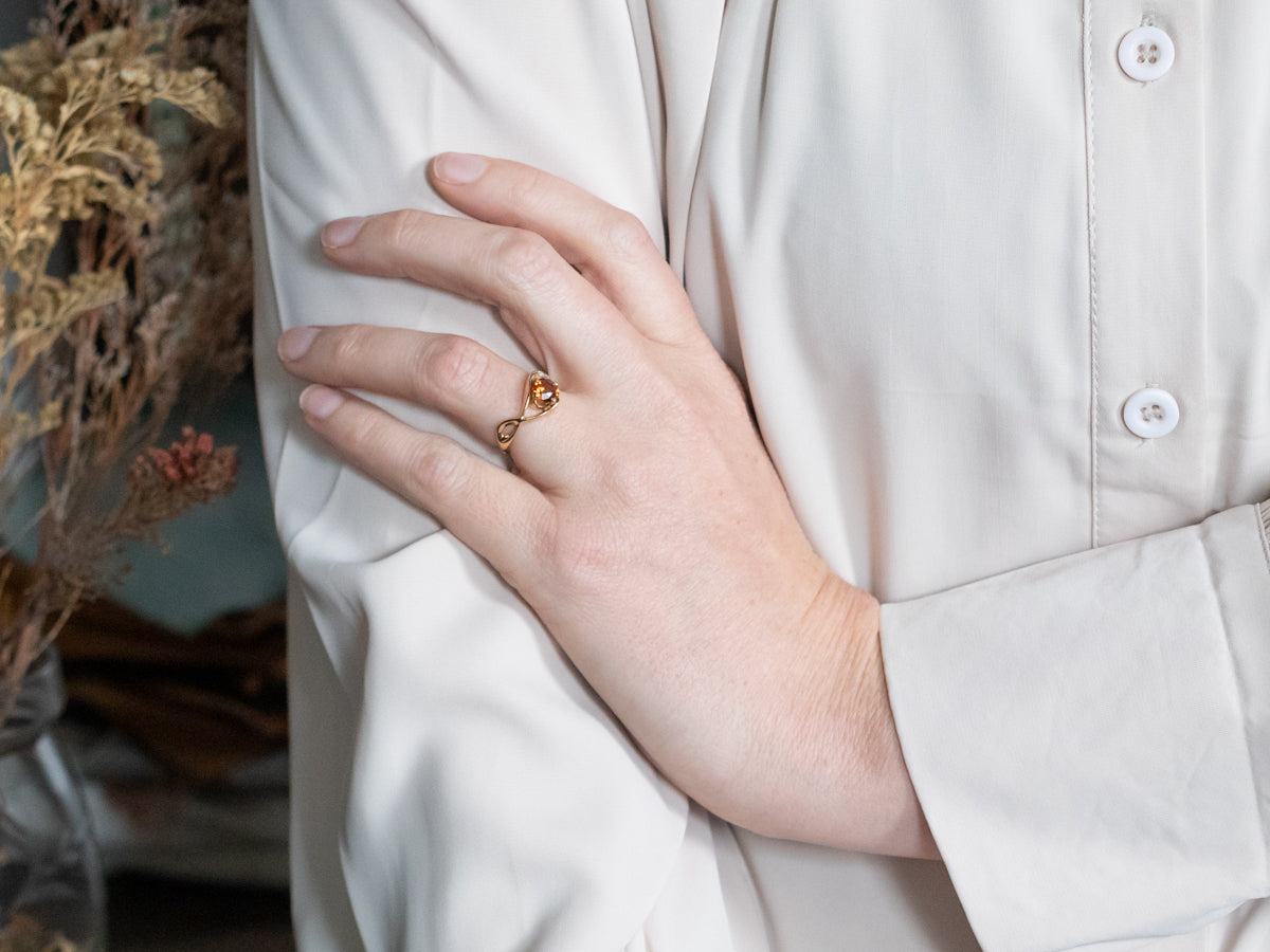 This beautiful yellow gold bypass ring features a Hessonite garnet and shimmering diamonds for a timeless and classic design. The round cut garnet is complimented by two sparkling diamonds, making this a stunning statement piece.