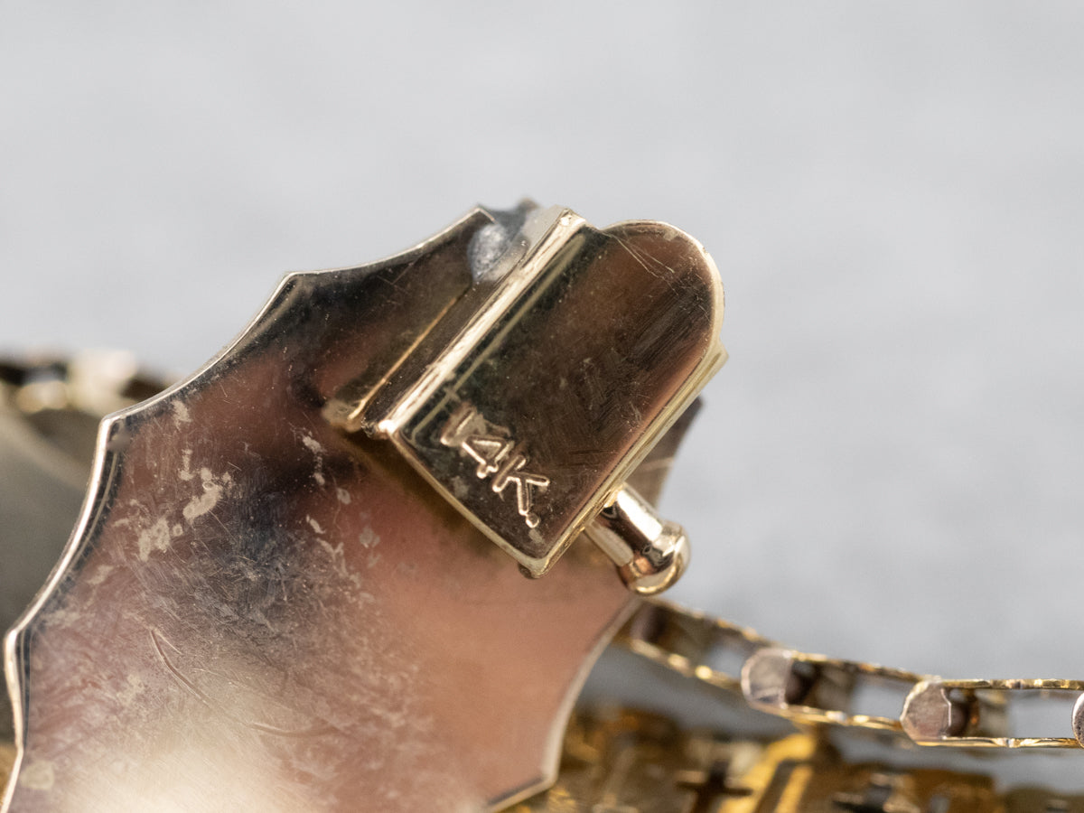 This beautiful Retro era bracelet was designed in the Victorian Revival style! Ornate repousse links are set with finely carved coral cabochons whose pink hues pair beautifully with the 14k gold. The pierced links create a lovely pattern on the wrist!