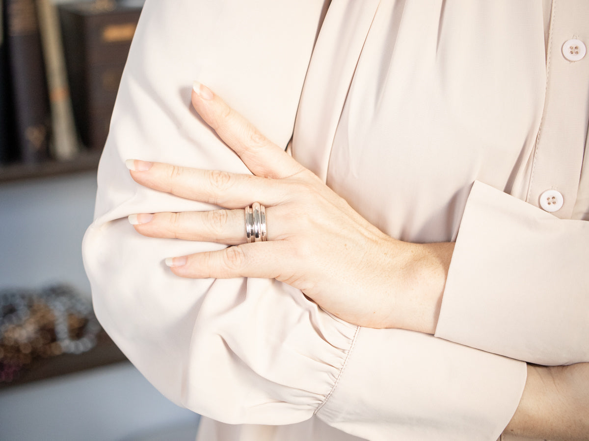 We call these types of bands a fidget or spinner bands due to the movement in the band itself; the design turns/spins freely along the larger part of the band. Crafted of 18-karat white gold and slight patina makes this a quite handsome piece!