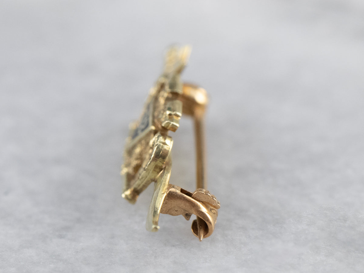 The attention to detail in this antique lapel pin is absolutely incredible, giving the double-headed eagle a sense of lifelike motion. This is a Masonic emblem, as denoted by the number 32 emblazoned in the center of the crisp black triangle, which makes this piece perfect for one's collection of Masonic jewelry!