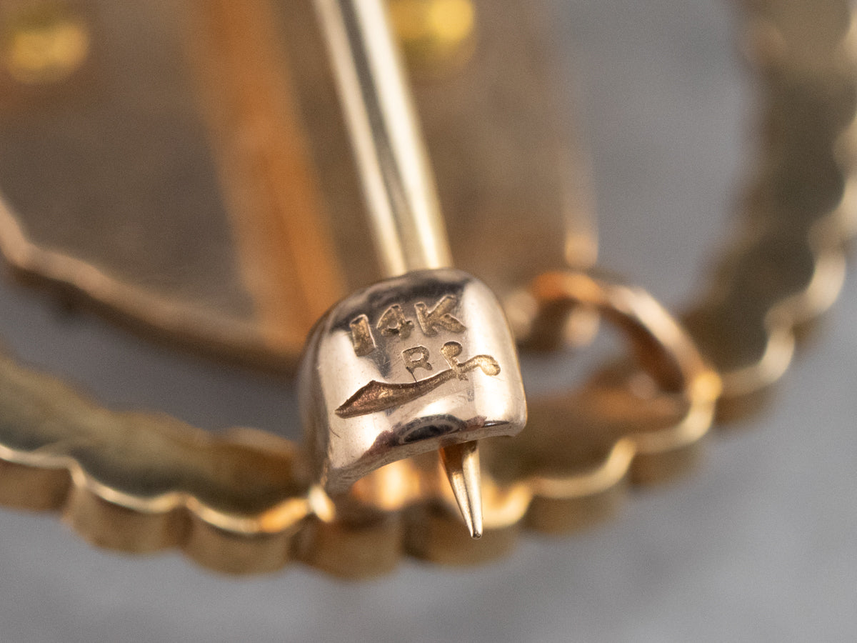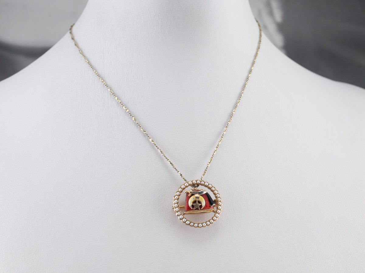 This beautiful antique lapel pin is centered with the iconic Shriners symbol! Enamel accents add beautiful colors to the piece, while the halo of seed pearls frames the emblem with classic sophistication. The design of the pin allows for a fine chain to be threaded through the back so you can wear it as a pendant as well.