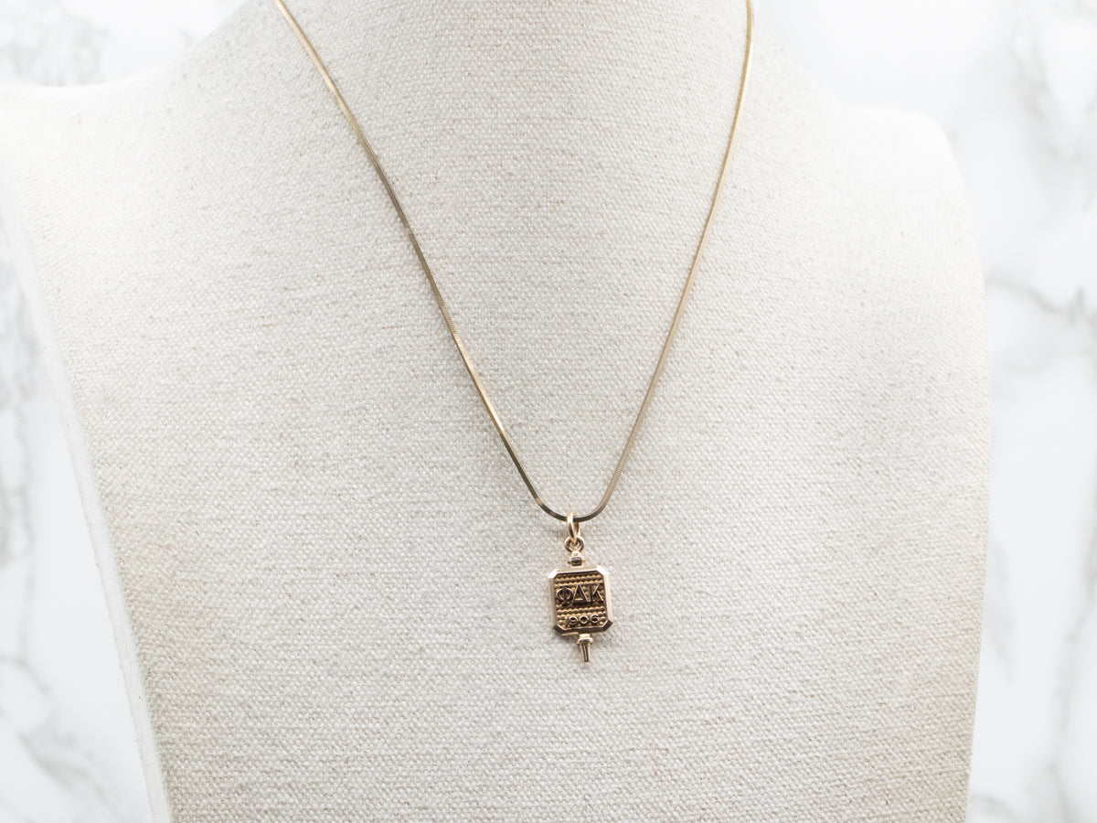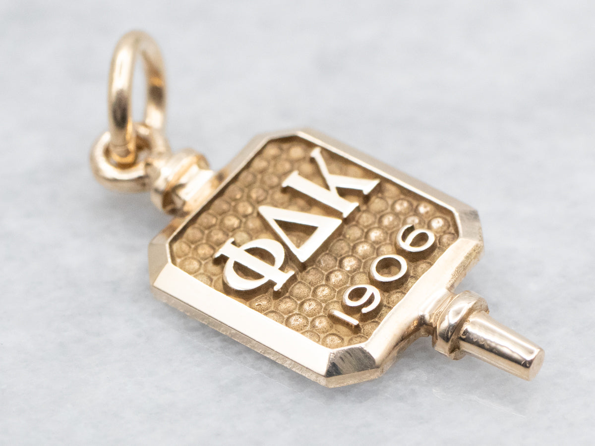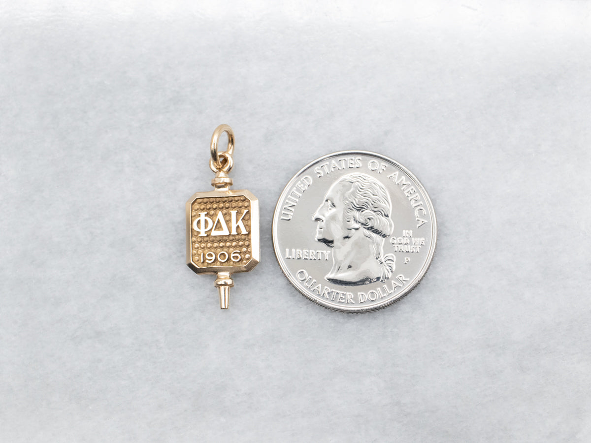 Unlock a stylish and meaningful look with this fraternal key charm! This charm features a yellow gold design with intricate details, perfect for adding a touch of elegance to any outfit. Show off your unique style and celebrate brotherhood with this timeless piece.