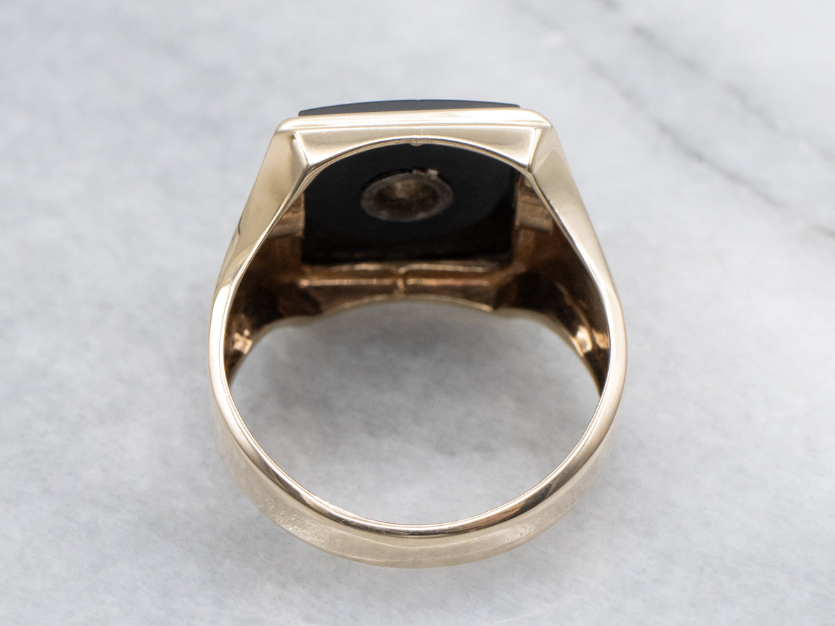 Metal: 10K Yellow and White Gold Gem: Black Onyx Gem Measurements: 12.0 x 13.8 mm, Rectangle Cut Accents: Diamond .12 Carats, I in Color, VS2 in Clarity Ring Size: 8.75 Marks: "10K" Stamped on the inside band