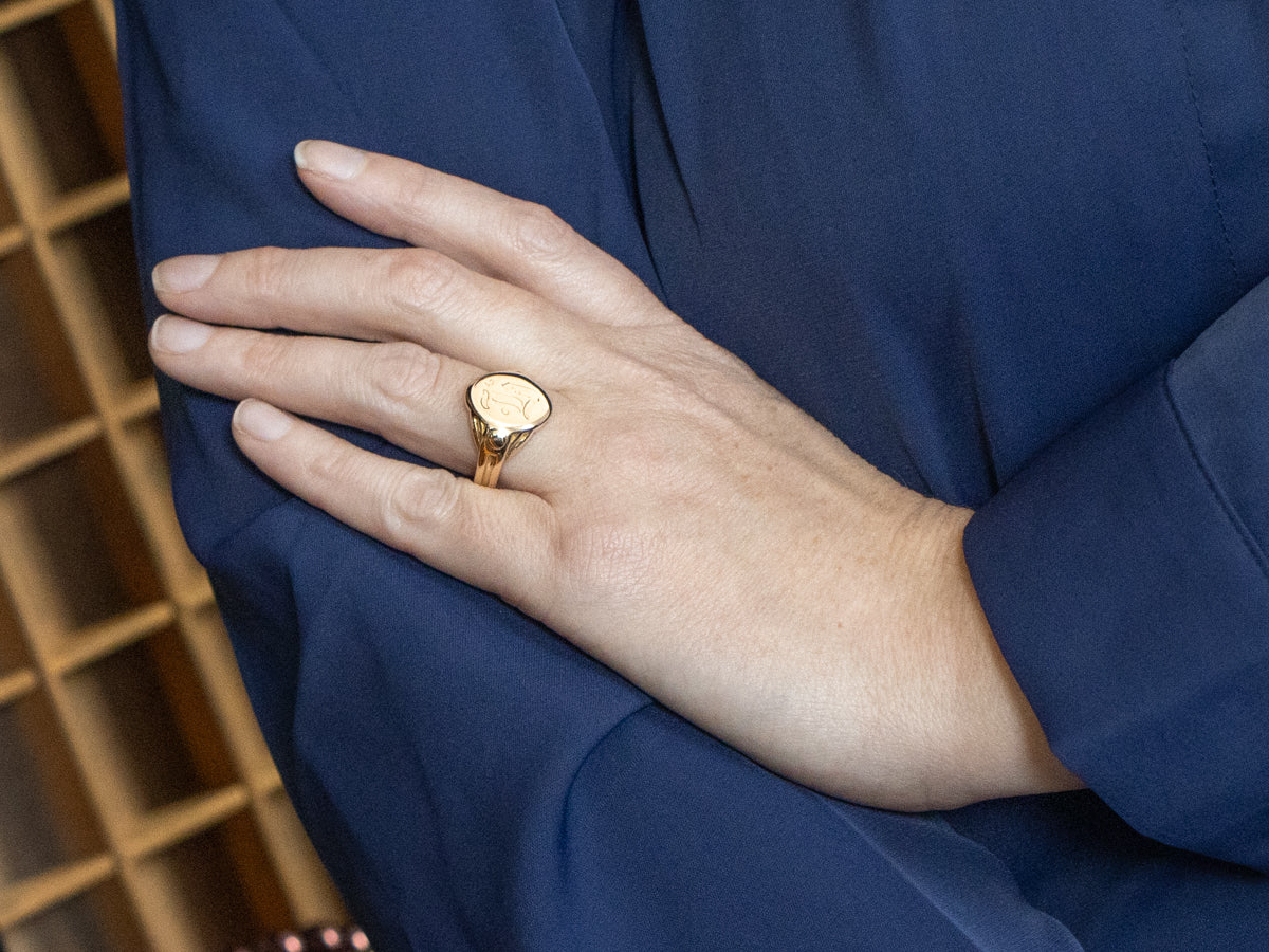 Metal: 10K Antique Gold Top Measurements: 11.0 x 15.0 mm, Oval Monogram: "T" in Old English Ring Size: 10.50 Marks: "10K" Stamped on the inside band