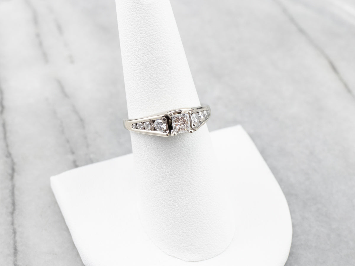 Absolutely timeless, this white gold engagement ring features a classic profile on the hand, with perfectly balanced shoulders channel set with bright diamonds. The center stone is gorgeous, a princess cut diamond, framed beautifully by the picture corner prongs!