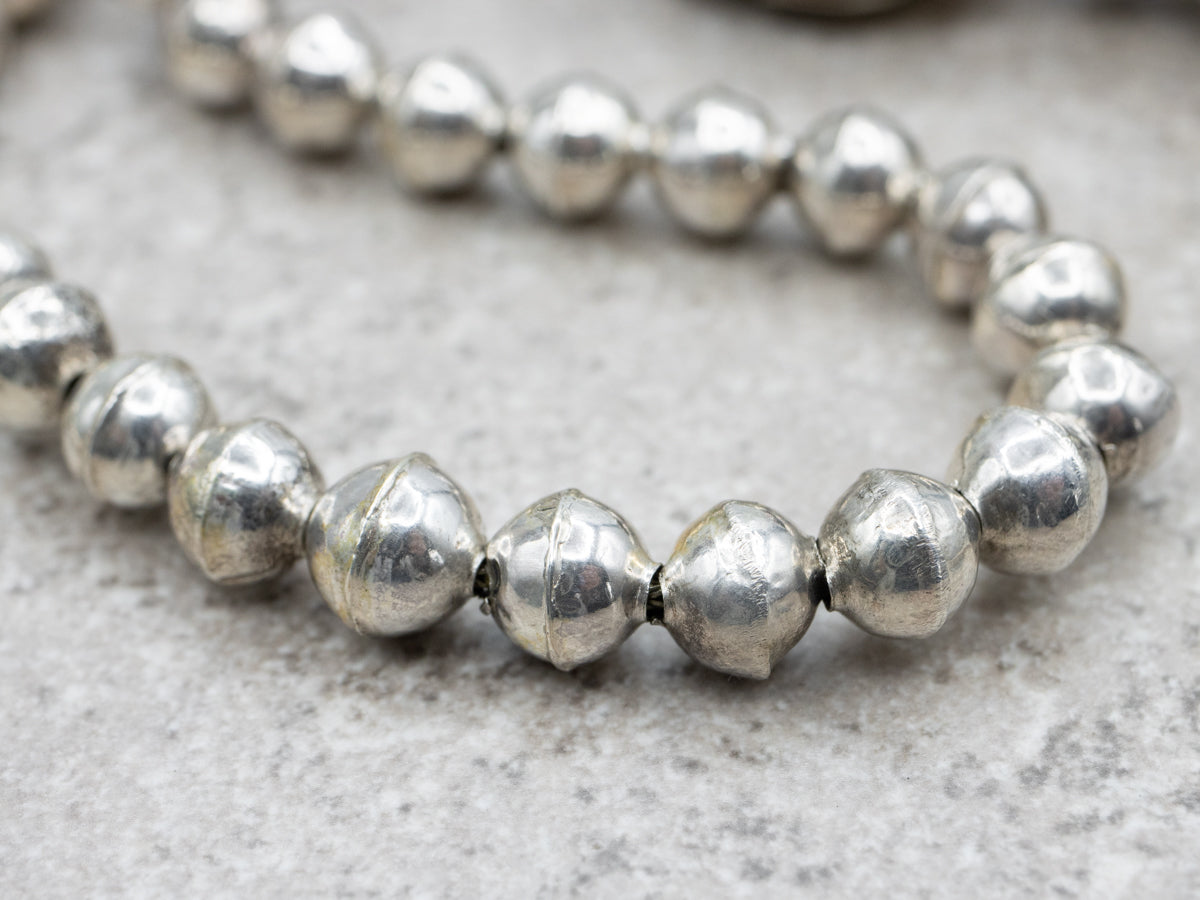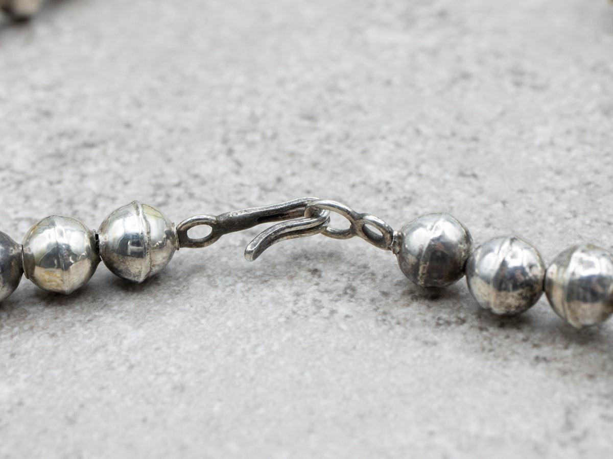 This stunning sterling silver squash blossom necklace is traditional in design, the single emblematic piece of jewelry that has come to define the renowned Native American silversmiths of the American Southwest. This necklace is wearable art, designed to be comfortable and commanding.