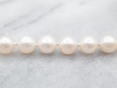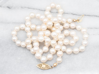 A precious addition to any jewelry collection, this pearl necklace features a classic yellow gold clasp and a gorgeous strand of saltwater pearls. Each pearl measures approximately 6 mm, offering a rich and luxurious look. Wear this timeless necklace and instantly upgrade any ensemble.