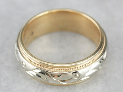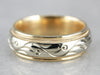 This pretty vintage band is easy and comfortable to wear! The inside of the band is curved in to what is called a 'comfort' fit, providing a soft feel on the finger. Beautiful stylized motifs surround the ring, and are complimented by the milgrain edging.