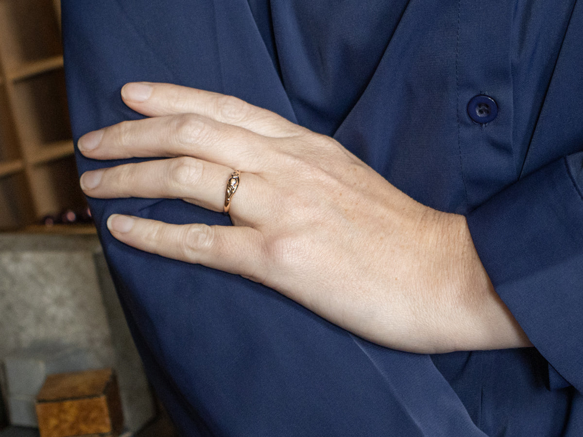 Crafted of warm antique rose gold, this band is distinguished by a polished gold ball centerpiece, adding a refined focal point to its delicate design. Its botanical-inspired artistry makes it a perfect symbol of enduring grace, whether worn alone or paired with other pieces. This band effortlessly blends classic charm with contemporary sophistication, making it a cherished addition to your jewelry collection.