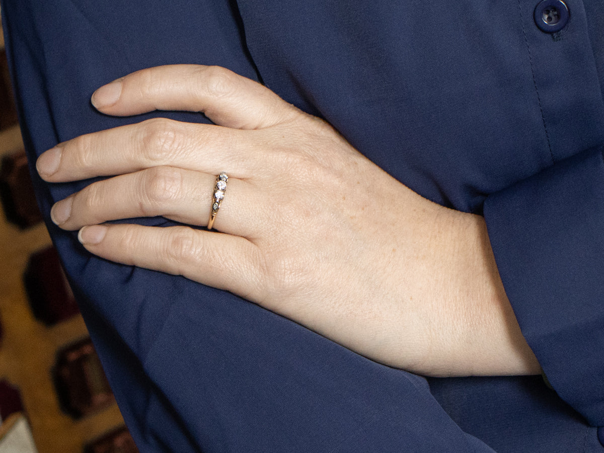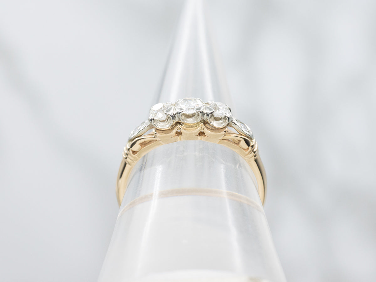 Metal: 14K Yellow and White Gold Gem: 3 Old European Cut Diamonds totaling . 35 Carats, H-I in Color, SI in Clarity Gem Measurements: 3.0 mm, Round Accents: 2 Diamonds Ring Size: 7.50 Marks: "GAUL -M-14-" Stamped on the inside band