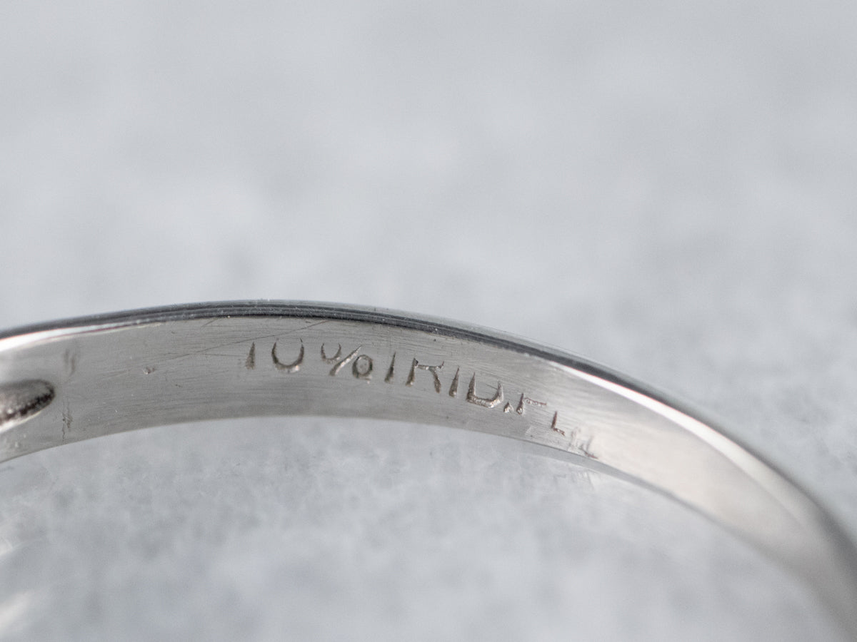 Metal: Platinum Gem: Old Mine Cut Diamond .91 Carats, SI1 in Clarity, M in Color Gem Measurements: 5.2 mm, Round Accents: 2 Diamonds totaling .16 Carats, SI1 in Clarity, G in Color Ring Size: 3.75 Marks: “10% IRID PLAT” Stamped on the inside band