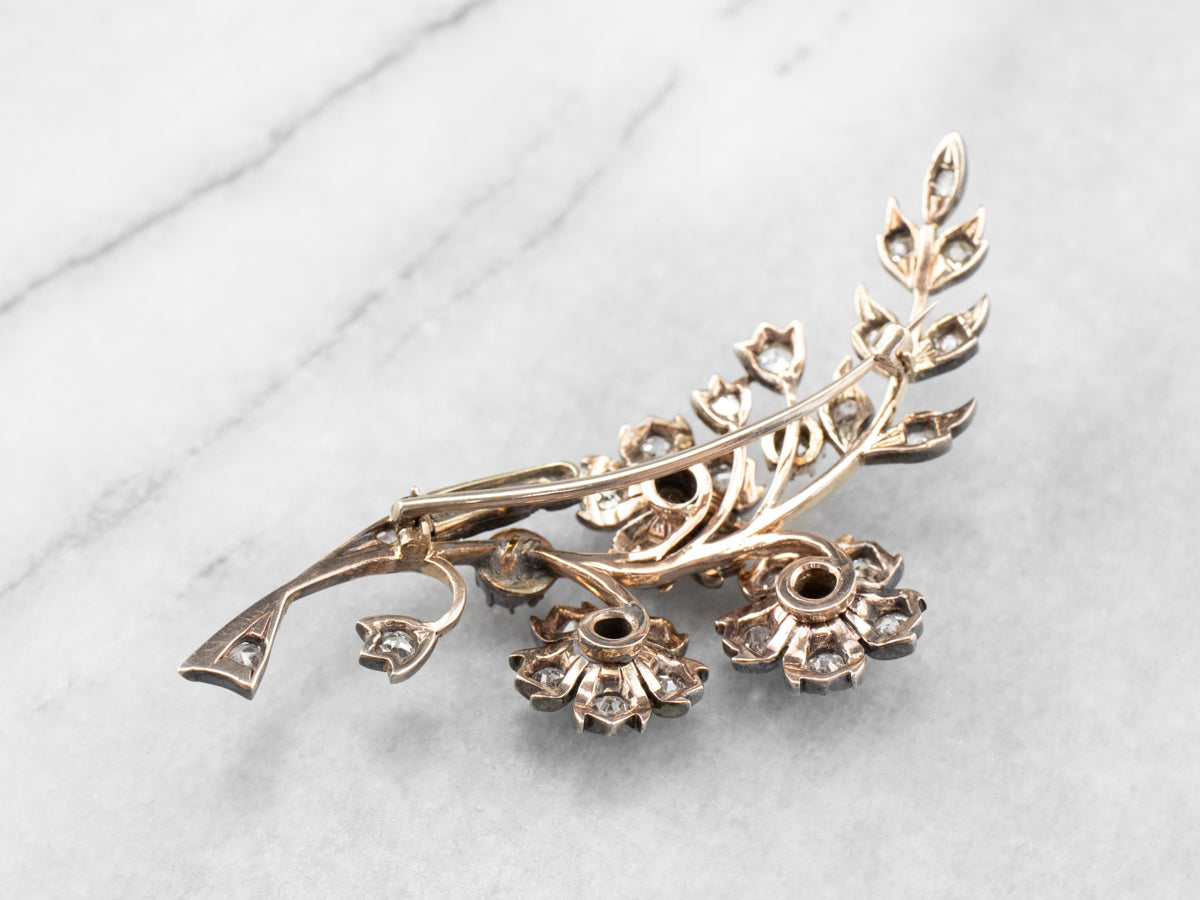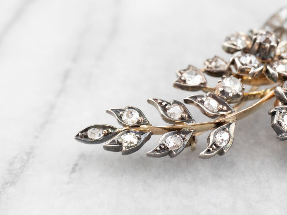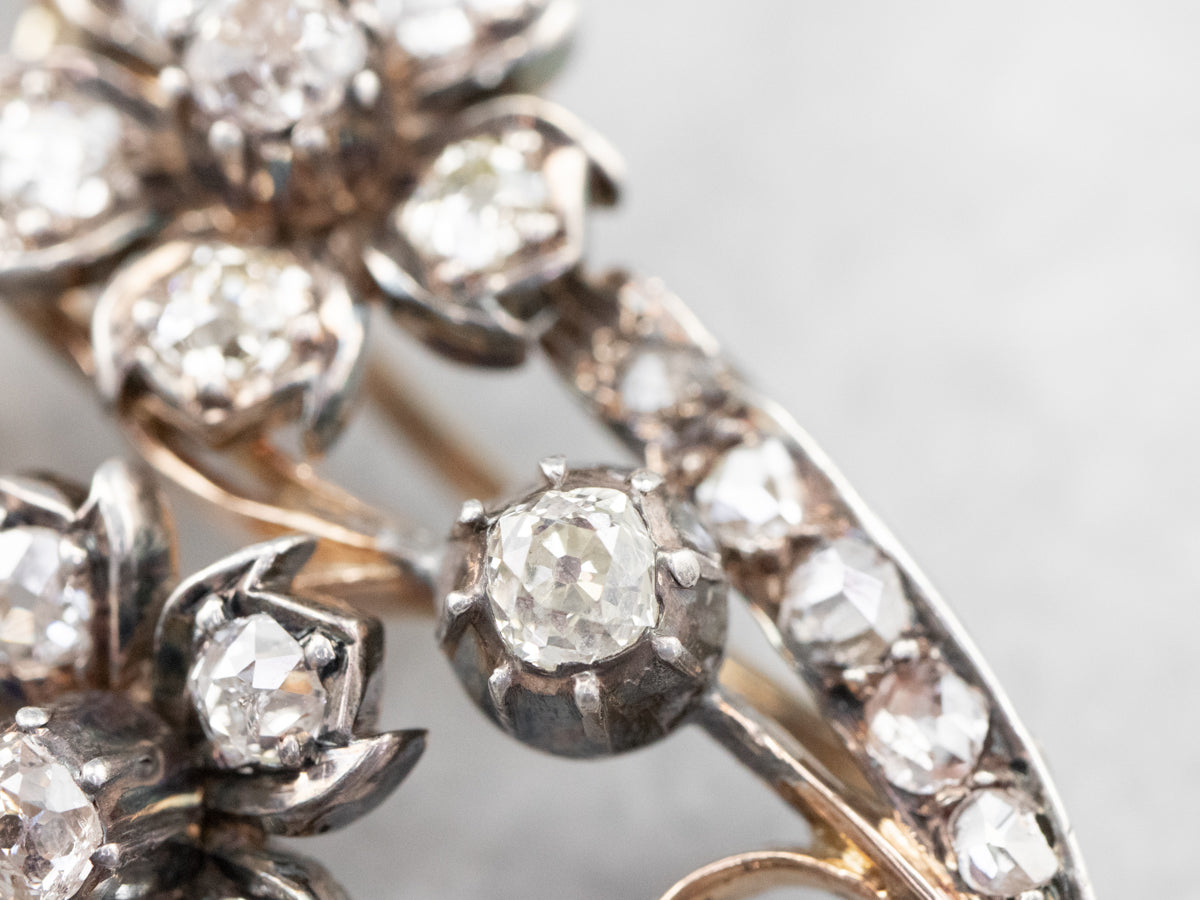 Stunning, antique pieces like this are becoming harder and harder to find, a true once in lifetime treasure! This brooch bears some of the classic hallmarks of Victorian-era jewelry. The piece exhibits incredible, ornate metalwork and antique hand-faceted rose and old mine cut diamonds, both true characteristics of Victorian-era jewelry that can only be achieved through hand fabrication. Before the advent of white gold in the 1920s, the white metals of choice were platinum and sterling silver. Far more affordable and easier to work, silver was frequently worked with fine diamonds and gems during this period, in a way that rarely occurs in modern times!