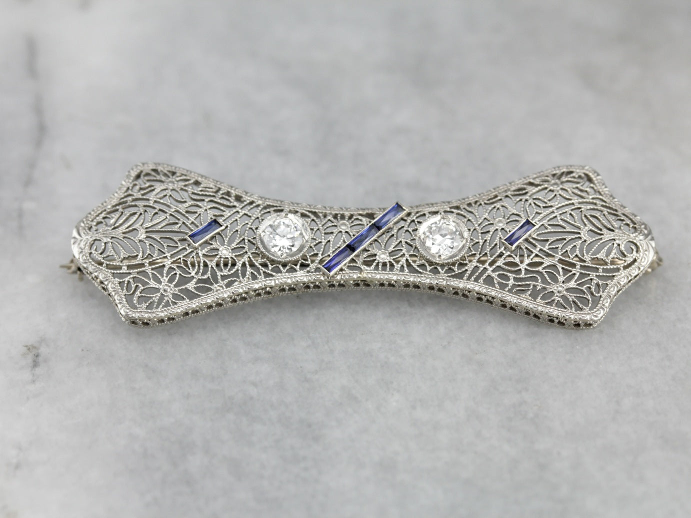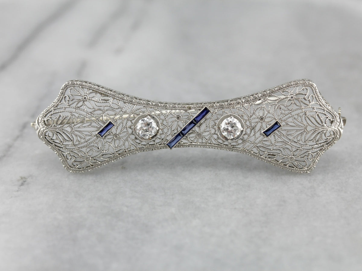 The delicate, lace-like filigree of this pin is the very definition of the Art Deco era! Created by die stamping, even the finest filigree of this era is incredibly strong and tough. The center of this beauty is set with a beautiful blue sapphire, likely synthetic as that was the norm for this era. To either side is set an exquisite diamond! This old mine cut stones weigh over one-fifth of a karat each! Feminine and sophisticated, this pin will look lovely worn on a lapel or sweater... or even on a wedding veil or bouquet ribbon!