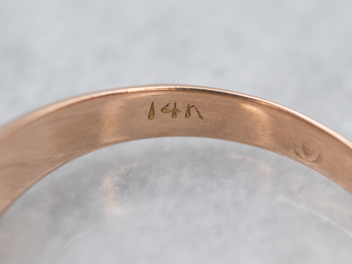 Metal: 14K Antique Rose Gold Gem: Old Mine Cut Diamond .13 Carats, SI2 in Clarity, J in Color Gem Measurements: 2.9 mm, Round Ring Size: 6 Marks: “14K” Stamped on the inside band