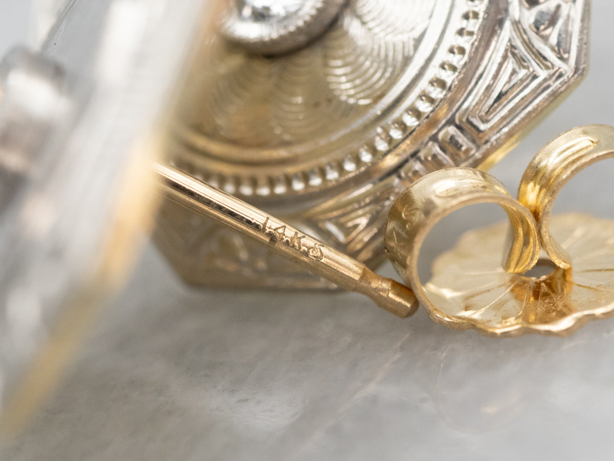 Metal: 14K White and Yellow Gold Gem: 2 Old Mine Cut Diamonds totaling .14 Carats, SI in Clarity, H in Color Gem Measurements: 3.3 mm, Round Measurements: 14 x 15 mm, Octagonal