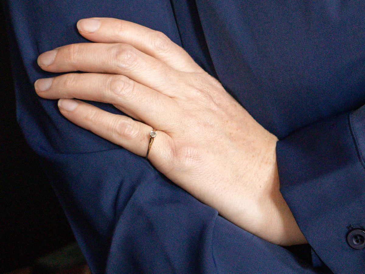 Metal: 14K Yellow Gold Gem: Old Mine Cut Diamond .20 Carats, SI2 in Clarity, J in Color Gem Measurements: 3.3 mm, Round Ring Size: 4.75 Marks: "14K" Stamped on the inside band