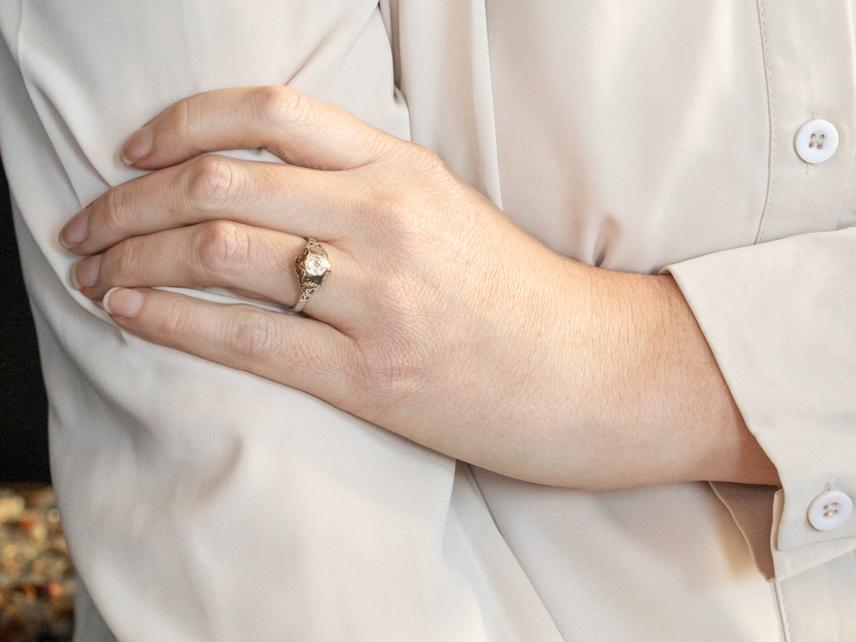 Metal: 14K White Gold Gem: Old Mine Cut Diamond .26 Carats, VS2 in Clarity, I in Color Gem Measurements: 4.4 mm, Round Ring Size: 7.75 Marks: "14K" Stamped on the inside band