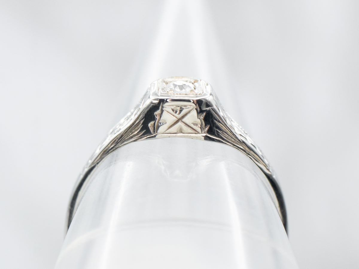 Metal: 10K White Gold Gem: Old Mine Cut Diamond .03 Carats, I1 in Clarity, G in Color Gem Measurements: 2.1 mm, Round Ring Size: 4.25 Marks: "10K" Stamped on the inside band
