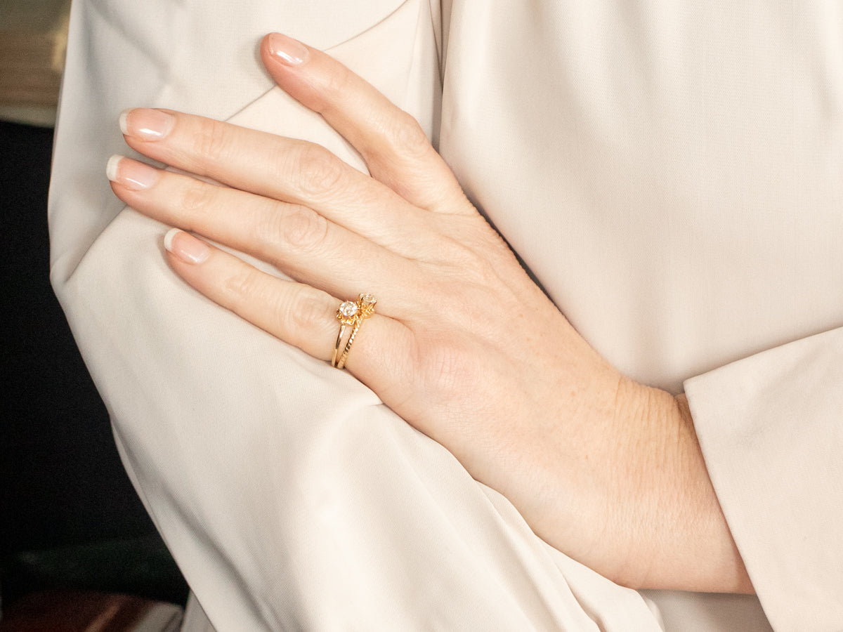 Bring vintage charm to your ensemble with this ring! Crafted from yellow gold, this ring features two shanks - one twisted and one plain - adorned with sparkling Old Mine Cut diamonds. A unique and stylish addition to any jewelry collection.