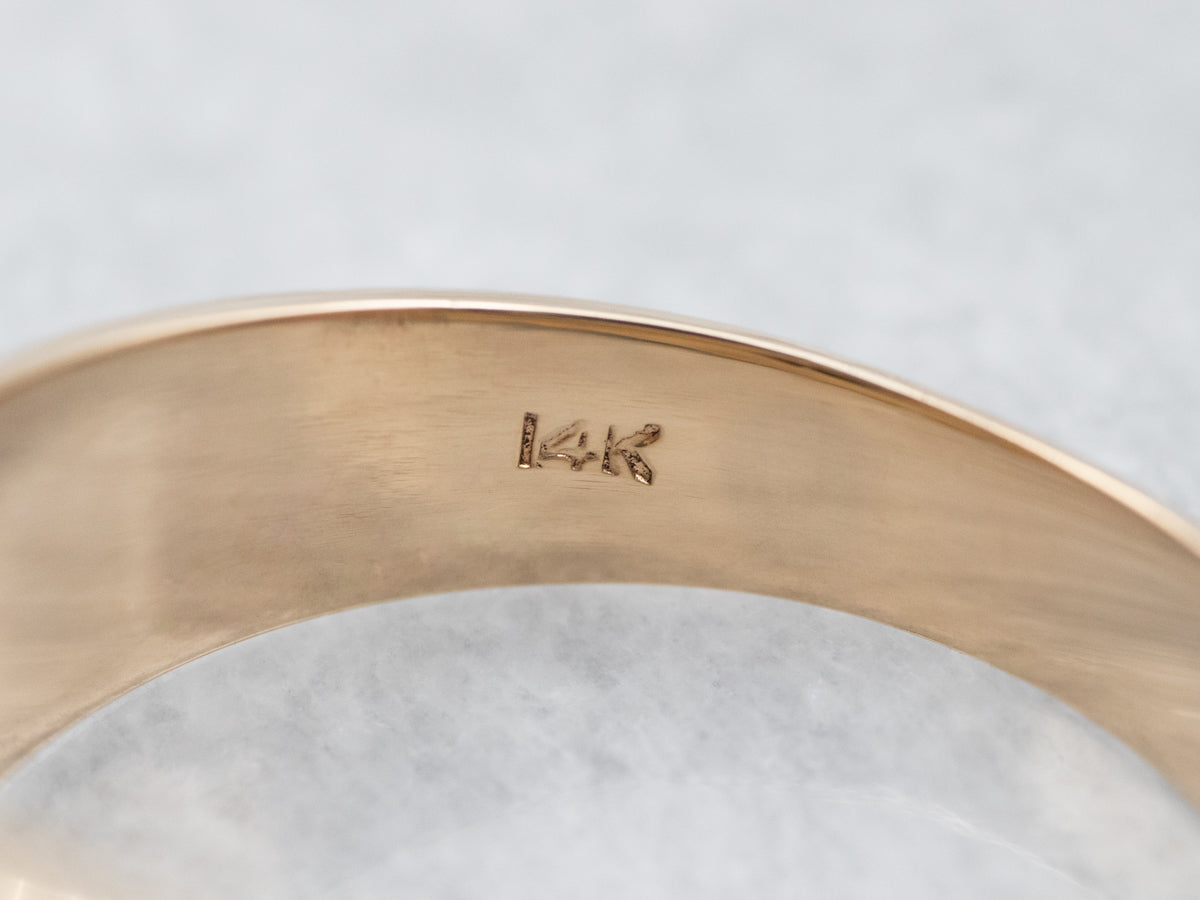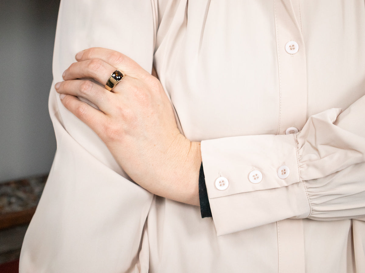 This simple gold mounting with its tab prongs is the perfect frame for the rich dravite tourmaline at its center. The deep, earthy brown gem is pierced by flickering glints of green and golden light when moved in the light! Dravite tourmaline is a pleochroic stone, meaning that it reflects more than one color; with the variety of hues and brightness of the stone determining its value. Weighing 3.47 carats, every facet of this amazing gem gleams with light and color, reflecting its incredible quality.