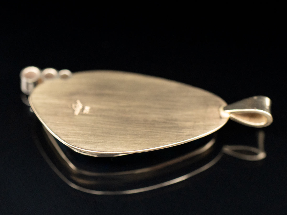 Metal: 14K Yellow Gold Gem: Opal Gem Measurements: 14.3 x 29.9 mm, Natural Shape Accents: 3 Diamonds totaling .17 Carats, SI in Clarity, H-I in Color Measurements: 19 x 44 mm, with bail Marks: "14K Morgan" Stamped on the reverse