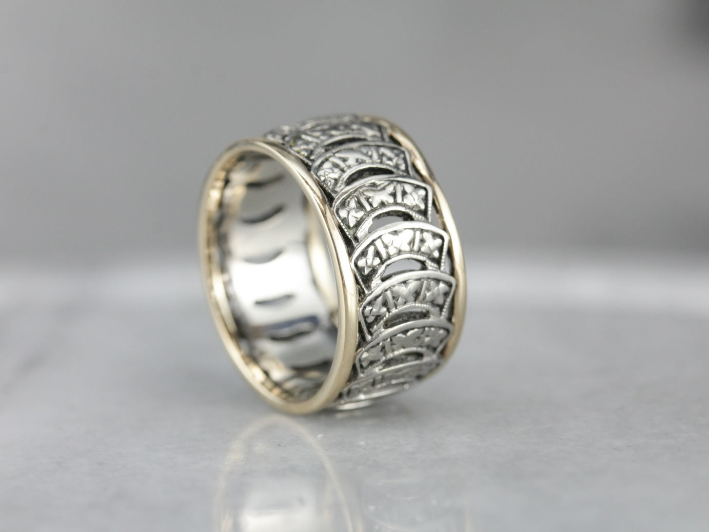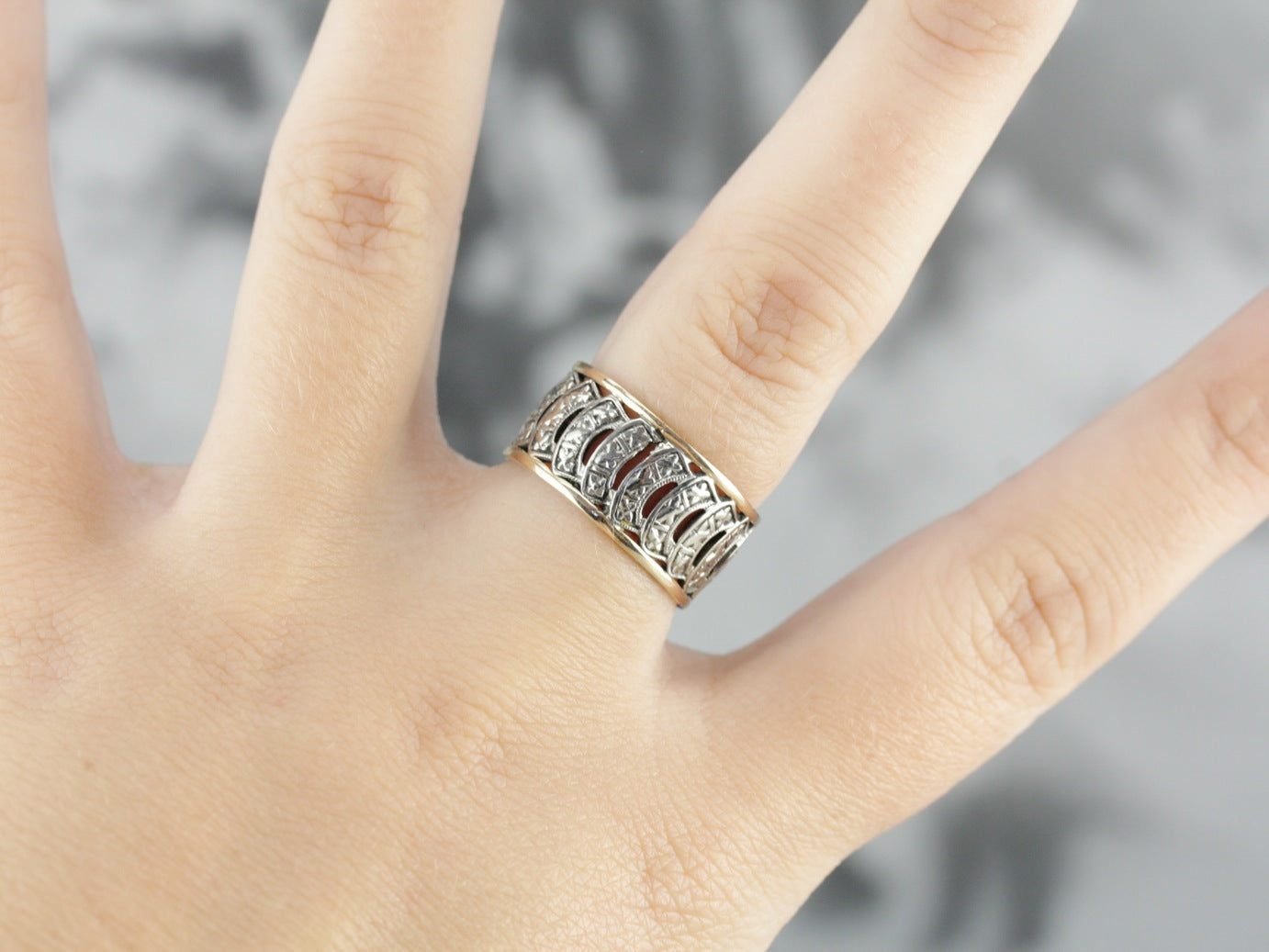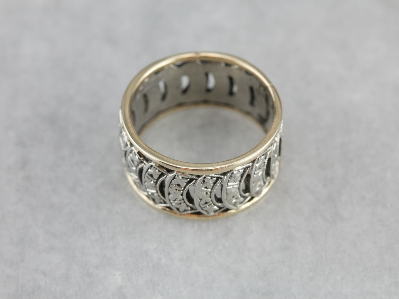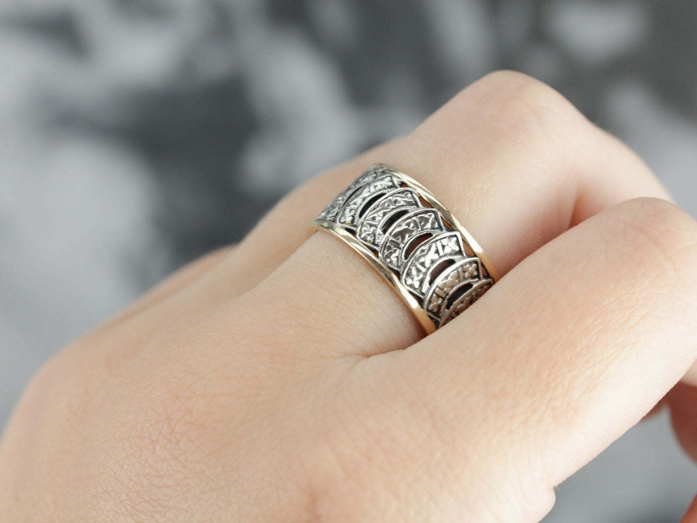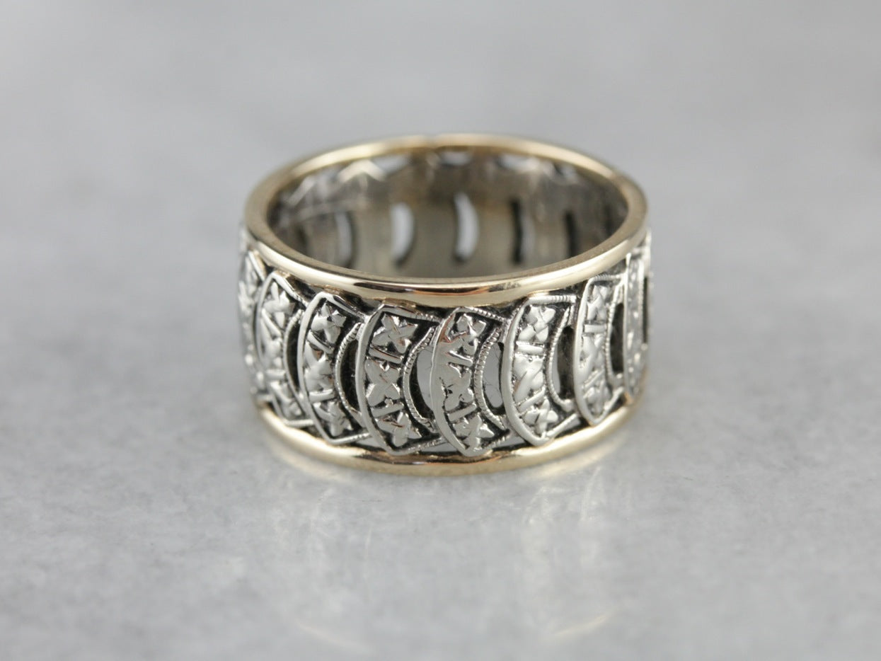 This handsome vintage band is easy and comfortable to wear! Beautiful stylized patterns encompass the ring, complemented by polished yellow gold edges. The pierced design and raised center allow this to remain comfortable on the finger, a great pattern for both sexes!