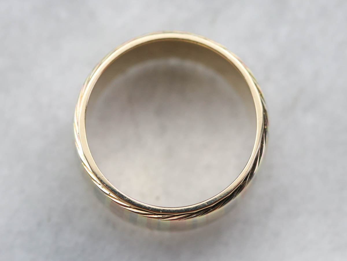 Mokume is the term for this style of goldwork, a wood grain pattern that is crafted by the repeated hammering and folding of different colors and qualities of gold. Mokume started in Japan, a jewelry version of the techniques perfected by master sword makers over the course of centuries.