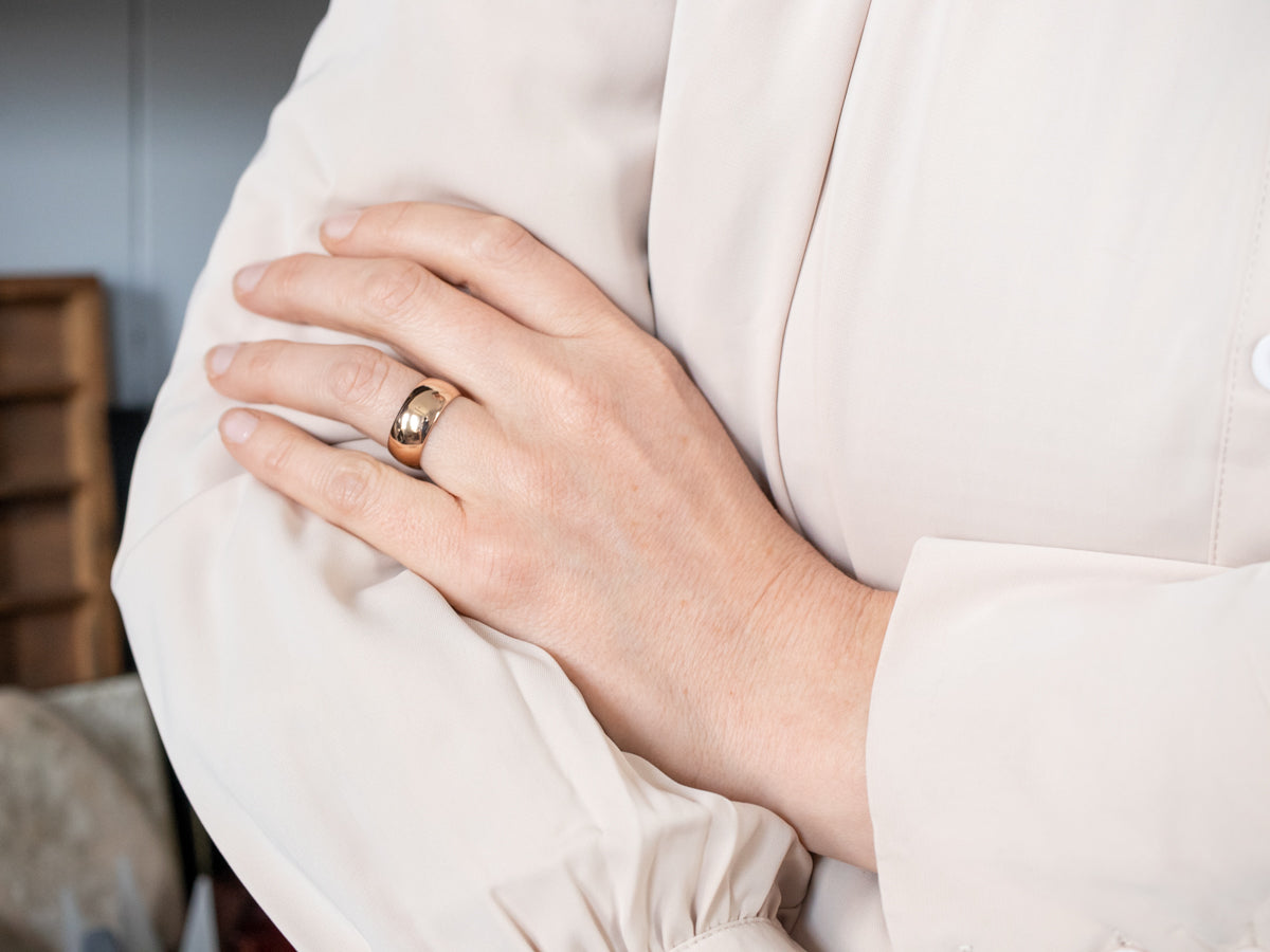 Simple and subtle, this wide antique band features a low dome on top and a beautiful, soft polish. The profile and finish are completely undecorated, giving this piece a nice profile for a man or a woman.