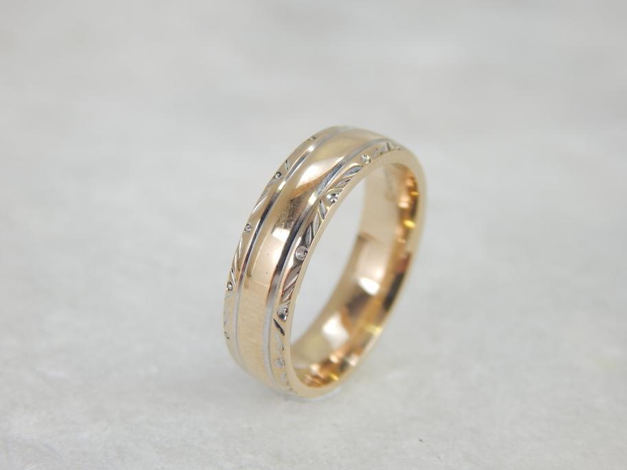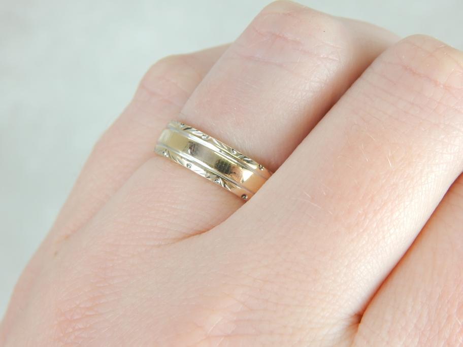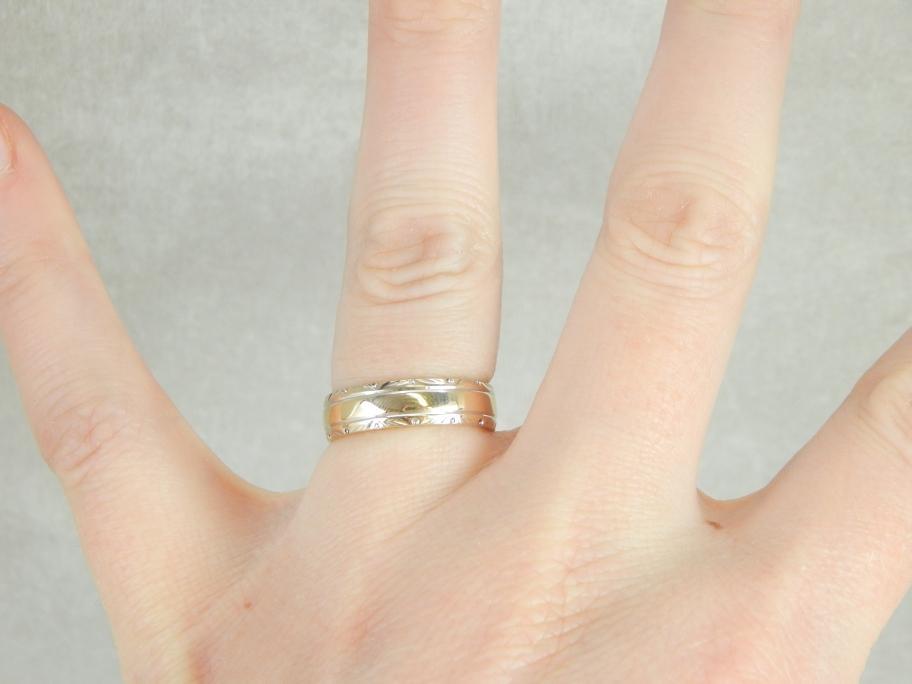 This sweet band has a whimsical yet simple pattern, a series of polished polka dots edged on each side with a simple engraved line.