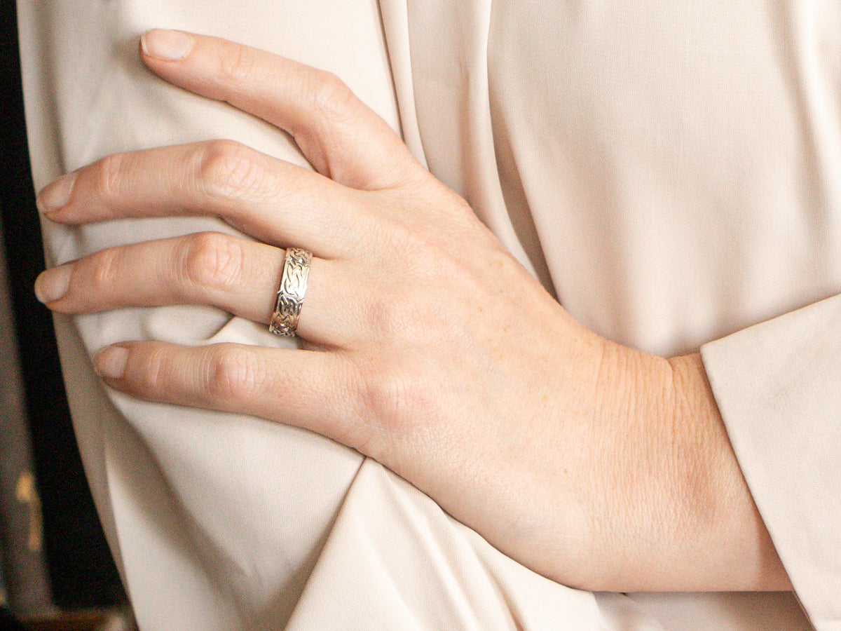 This white gold wedding band has a simple but well-defined Celtic knot pattern adorns this men's band. The top of the ring has just the slightest curve to it, while the inside has a soft, rounded, comfortable fit.