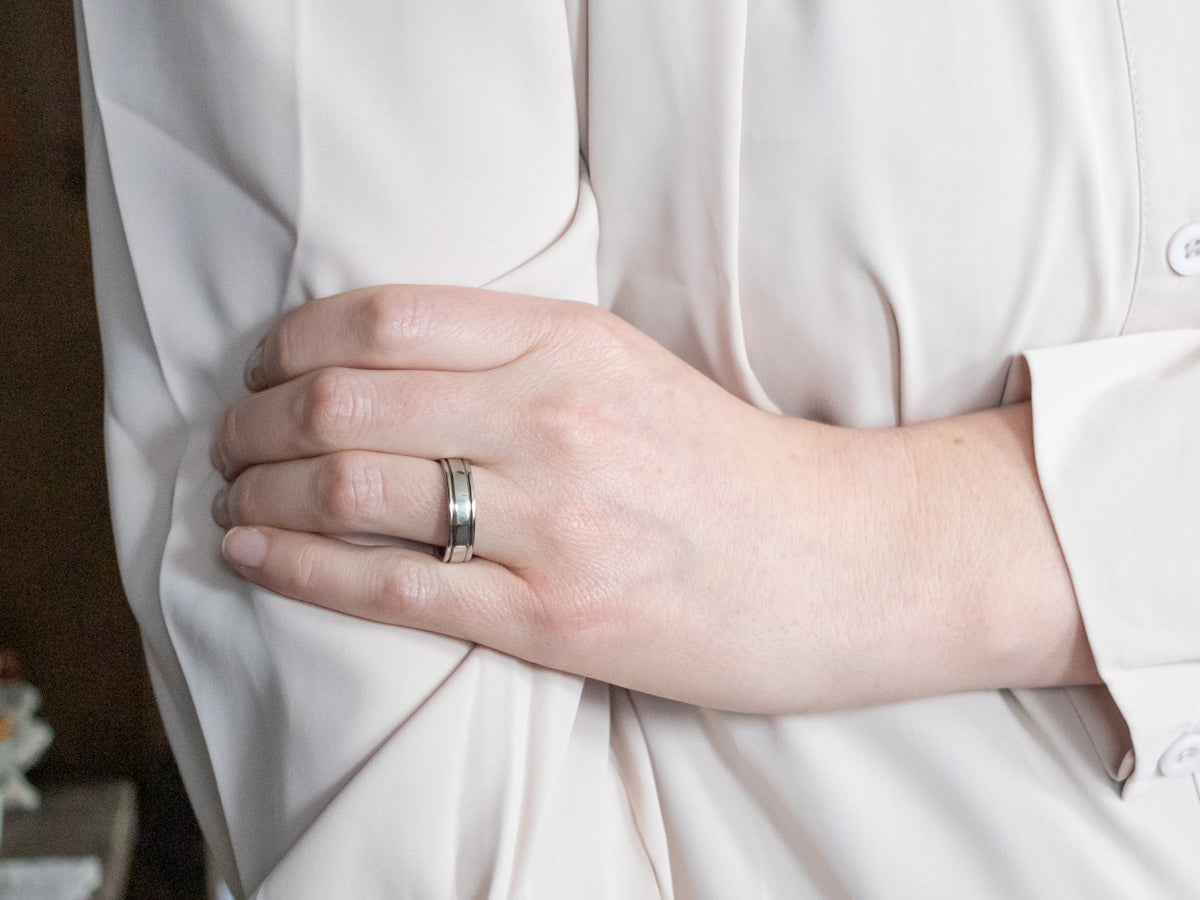 Simple and subtle, this wedding band features straight sides and a beautiful, soft polish. The line edge brings some dimension to this piece. The profile and finish are classic, giving this piece a nice look for a man or a woman. This band has a perfect polish and is ready to wear!