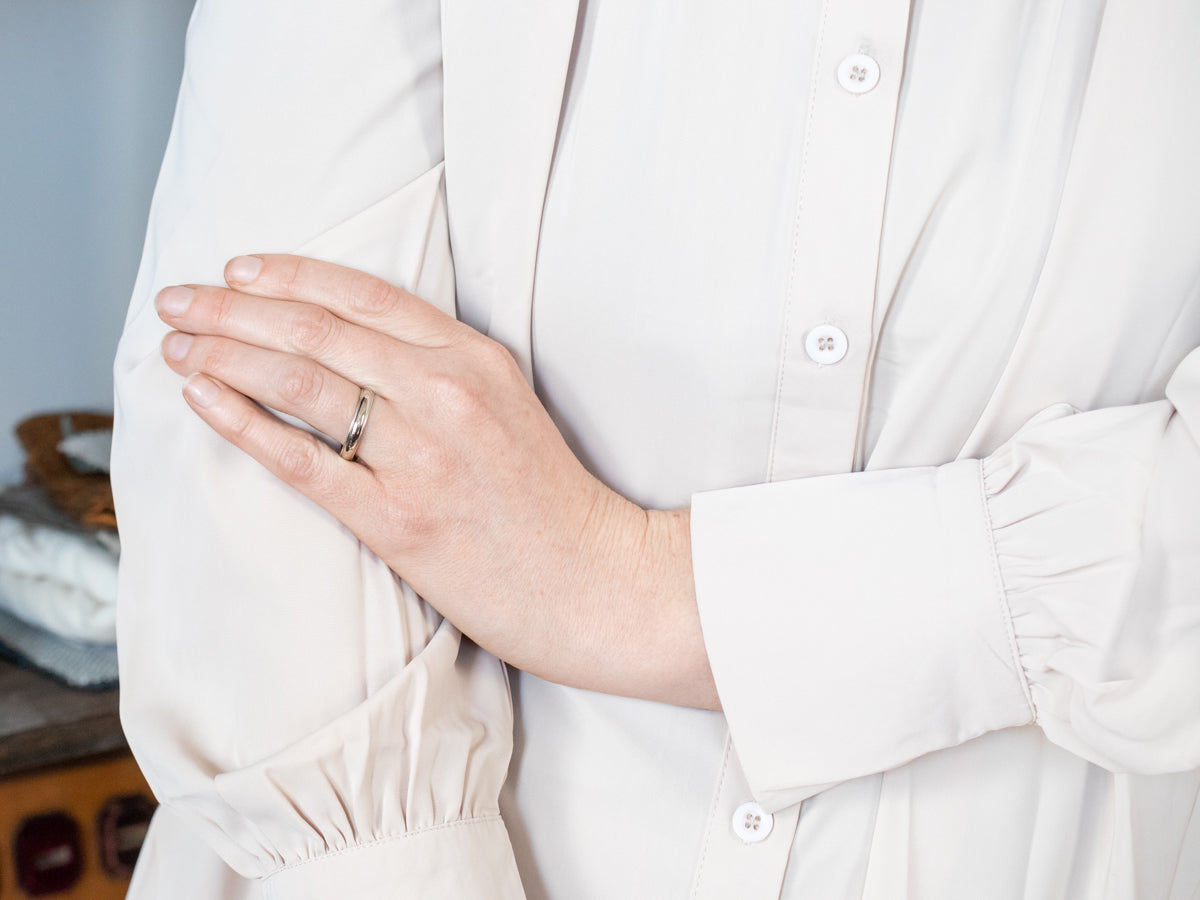 Simple and subtle, this comfort fit band features a low dome on top and a beautiful, soft polish. The profile and finish are simple, with just a milgrain decoration, giving this piece a nice profile for a man or a woman. This band has a perfect polish and is ready to wear.