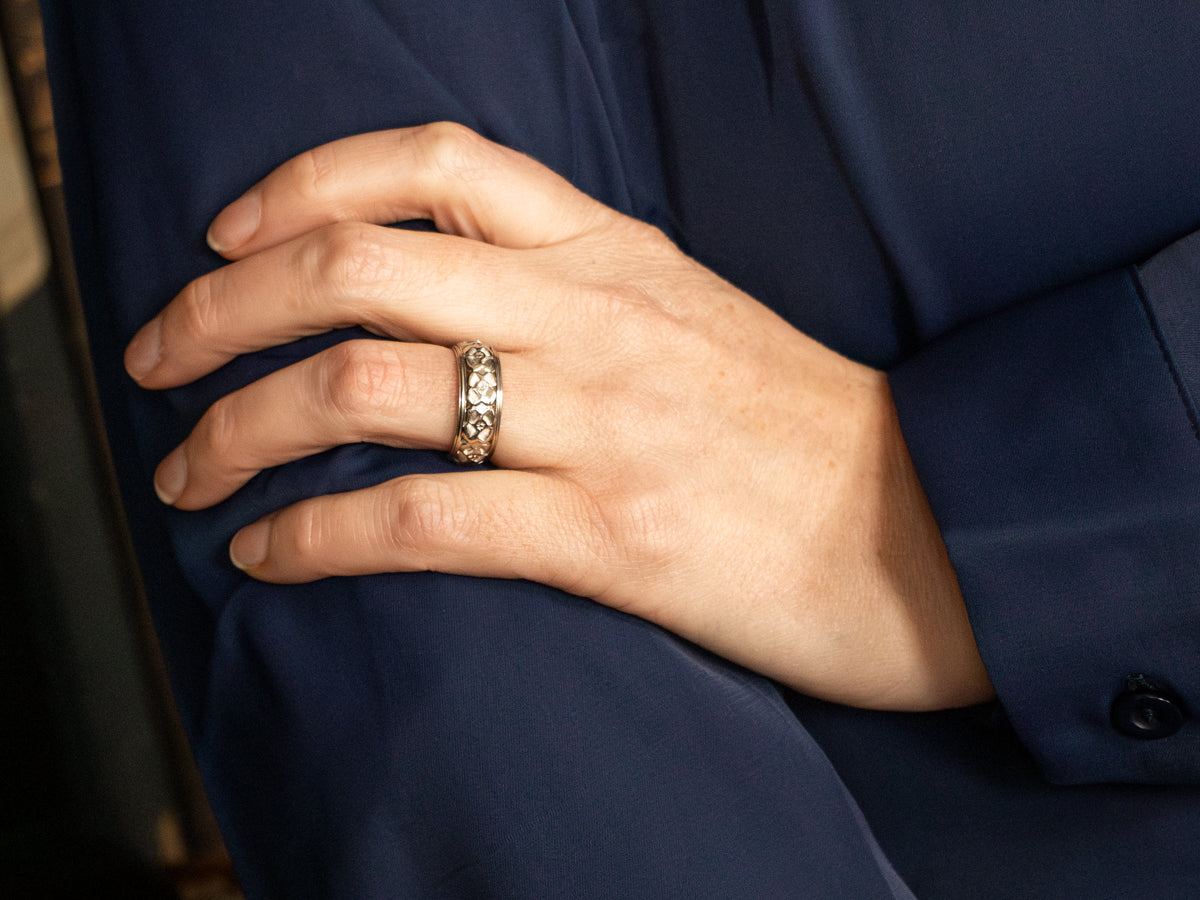 Textured flowers adorn this white gold band. Its wide width makes a statement, while the delicate openwork adds dimension. Whether wearing alone or stacking with others, this band is sure to be a treasured piece in your collection.