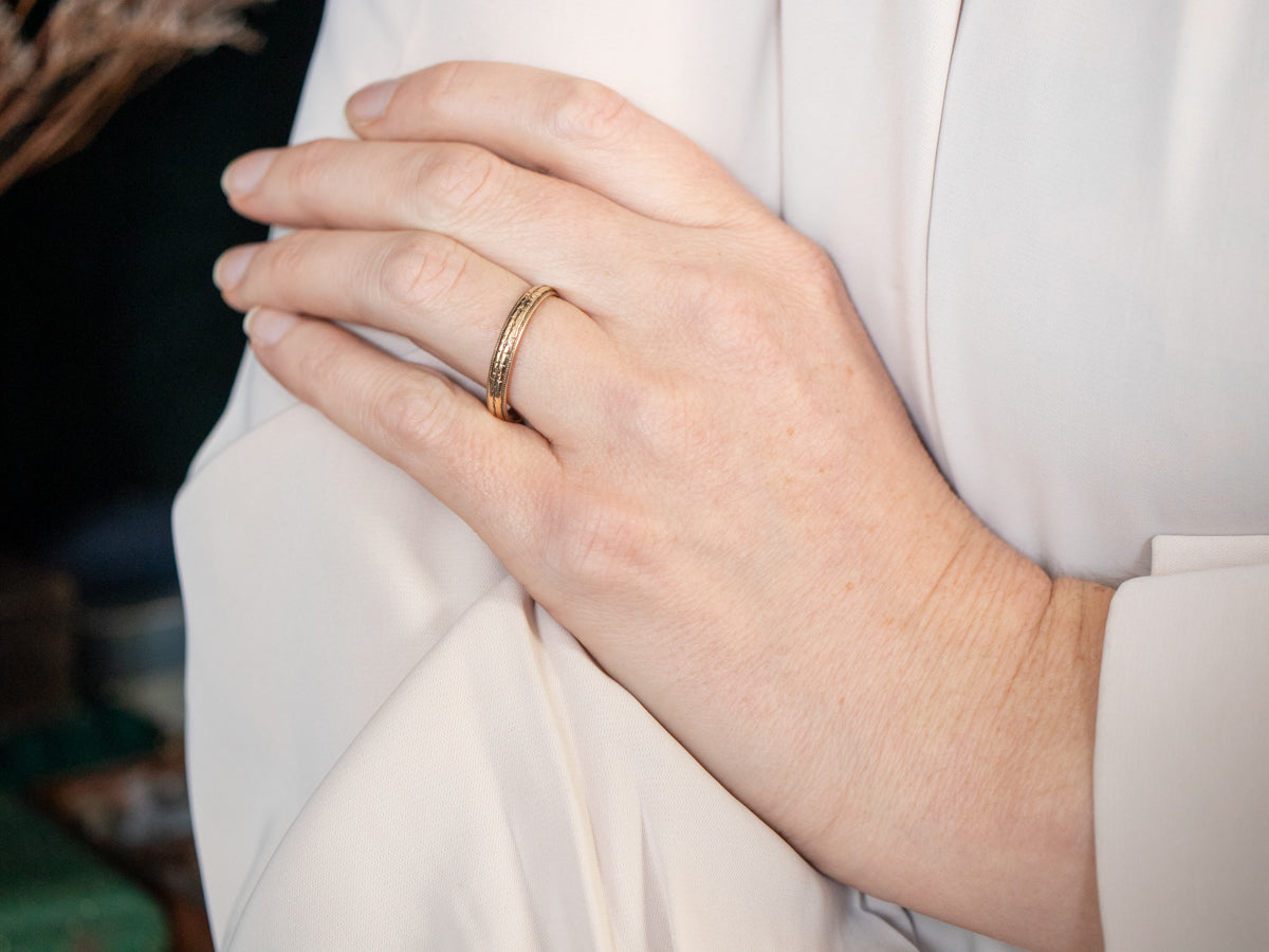 This piece is quite unique, an exquisite yellow-gold pattern band in a stunning size 11.50! Its larger size makes this the perfect band for a man who loves a traditional motif with a slight patina and classic milgrain edge!