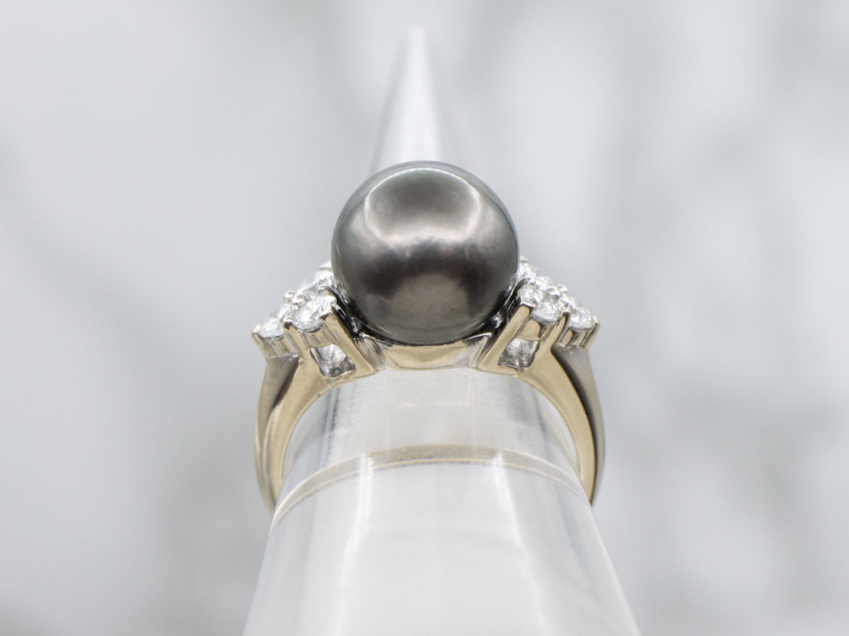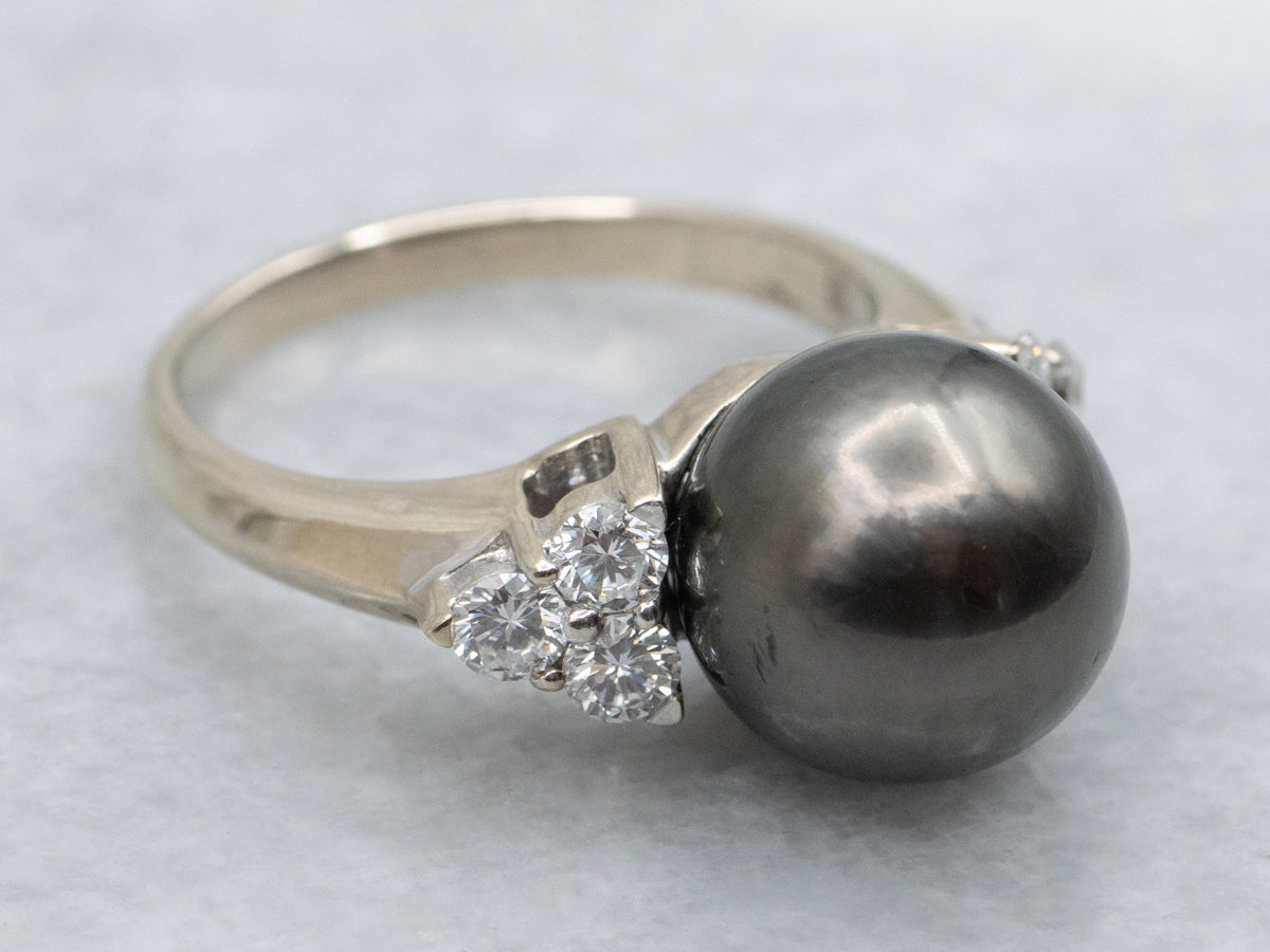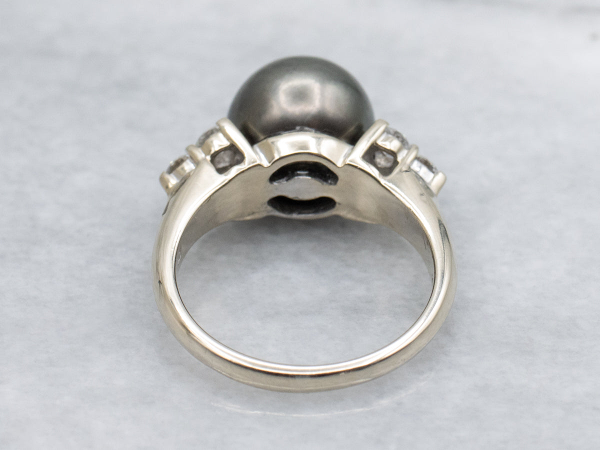 Metal: 14K White Gold Gem: Black Pearl Gem Measurements: 10.6 mm, Round Accents: 6 Diamonds totaling .45 Carats, G-H in Color, VS-SI in Clarity Ring Size: 7 Marks: "14K" Stamped on the inside band